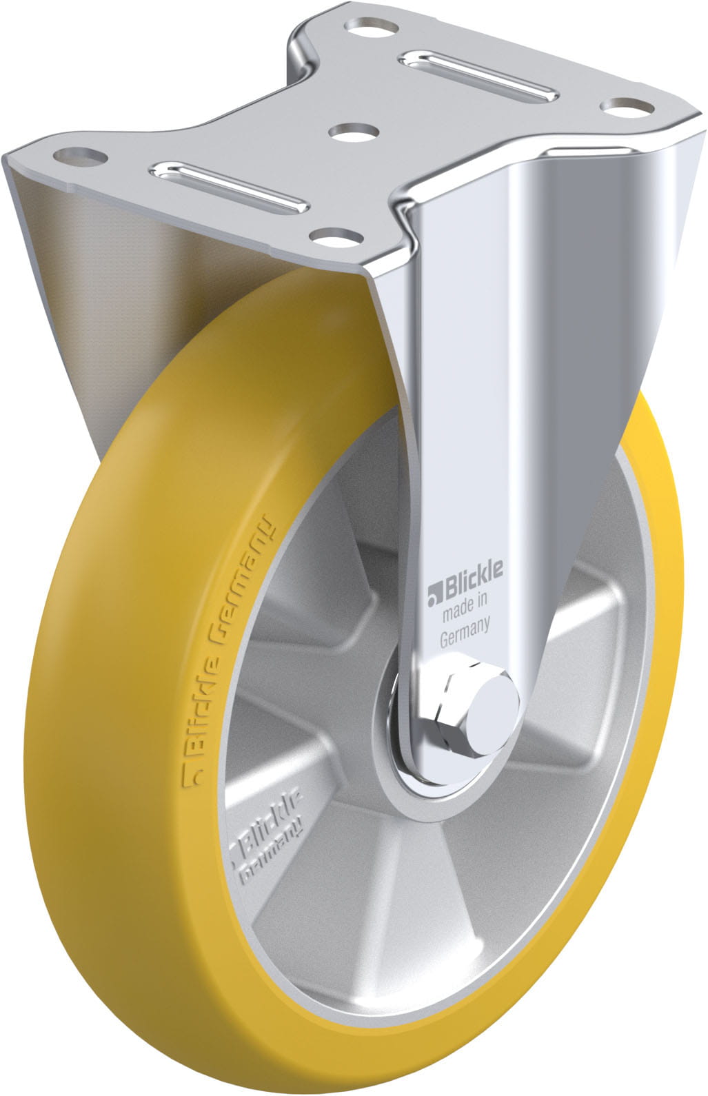 Pressed steel fixed castor, medium duty design, with top plate fitting Heavy duty wheel, with Blickle Extrathane® polyurethane tread, with aluminium wheel centre, with extra crowned running tread