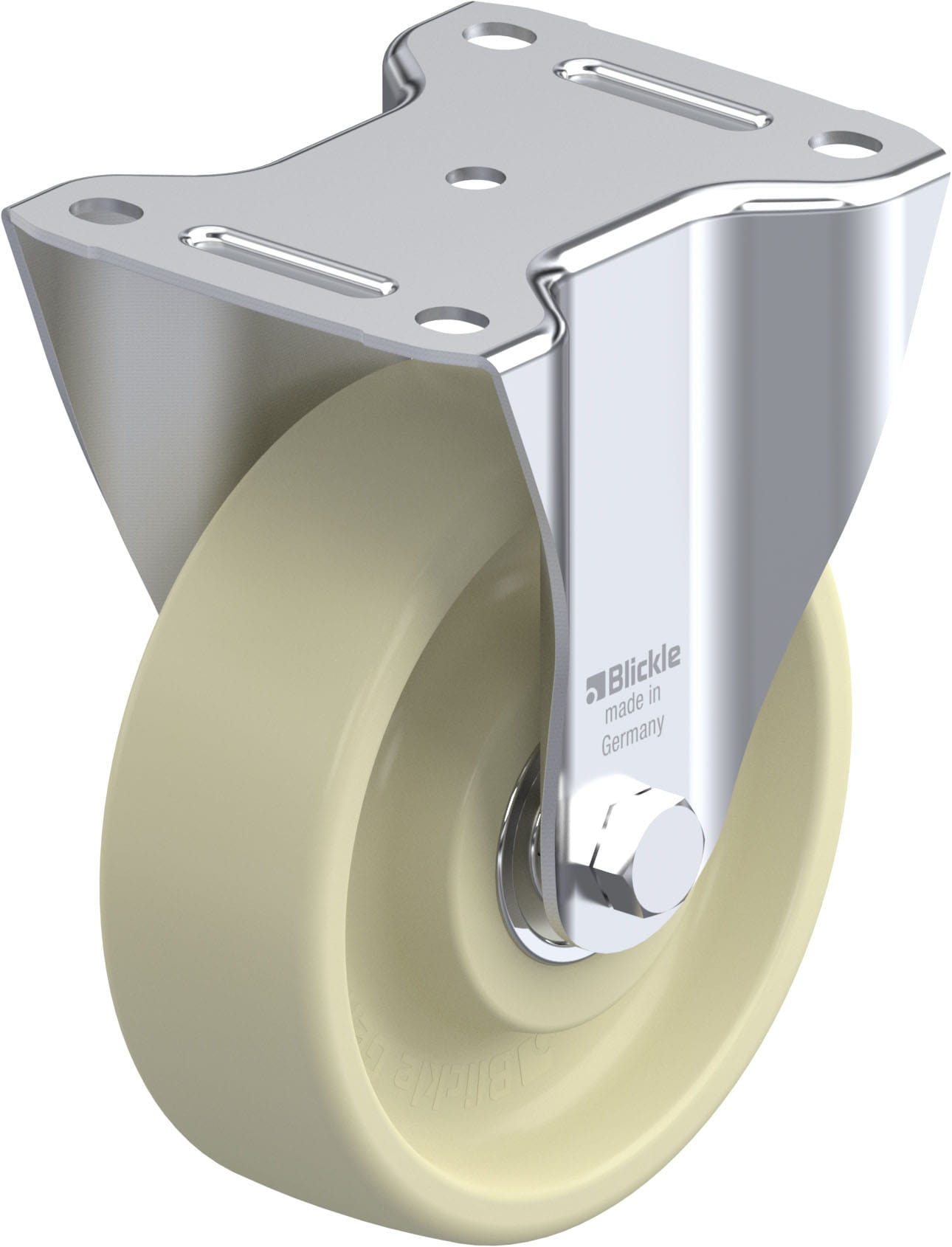 Pressed steel fixed castor, medium duty design, with top plate fitting, nylon wheelBracket: B seriespressed steel, zinc-plated, blue-passivated, Cr6-f...