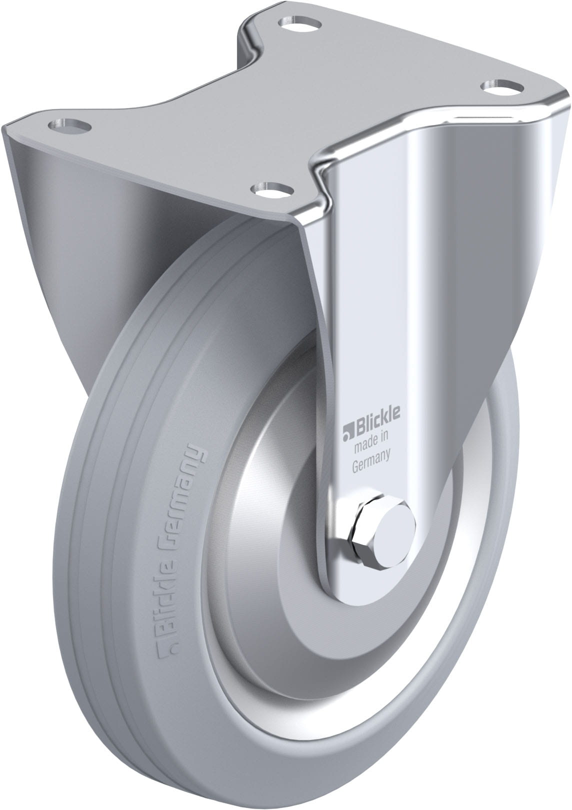 Pressed steel fixed castor, medium duty design, with top plate fitting, wheel, with standard solid rubber tyre, with pressed steel rim, reinforced design, non-marking, grey, with steel thread guard