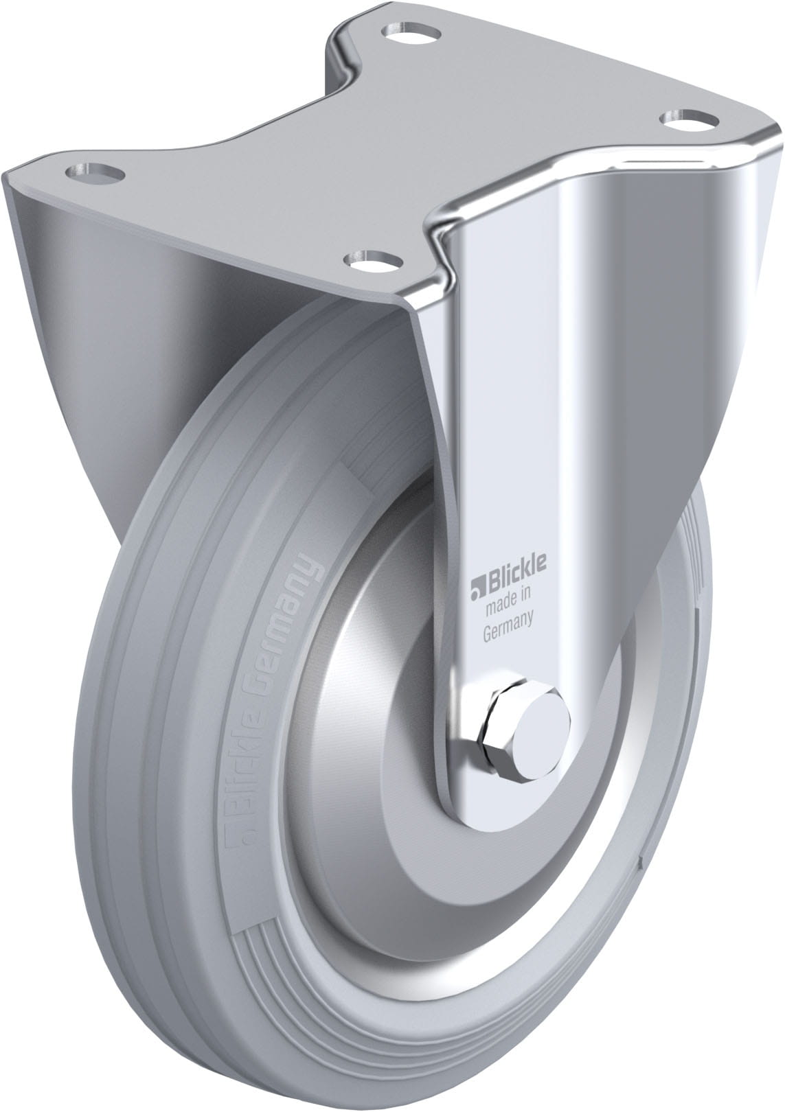 Pressed steel fixed castor, medium duty design, with top plate fitting, wheel, with standard solid rubber tyre, with pressed steel rim, non-marking, grey, with steel thread guard