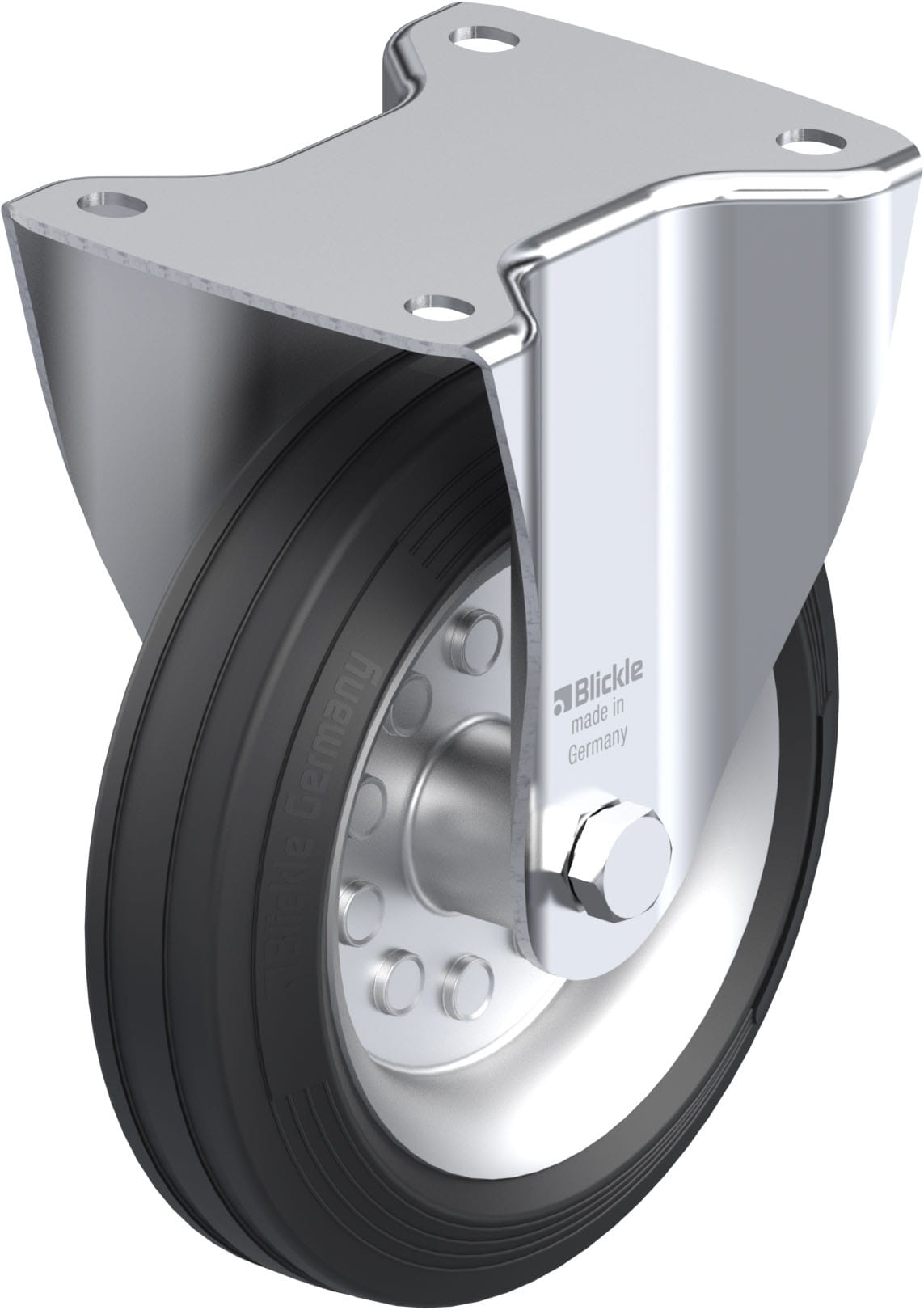 Pressed steel fixed castor, medium duty design, with top plate fitting, wheel, with standard solid rubber tyre, with pressed steel rim
