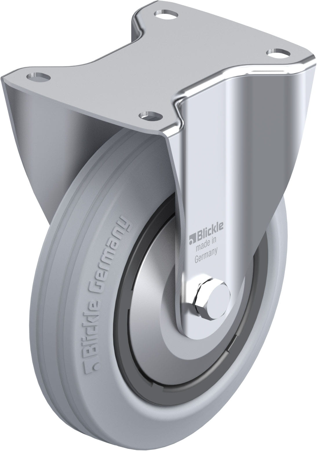 Pressed steel fixed castor, medium duty design, with top plate fitting, wheel, with standard solid rubber tyre, with synthetic rim, non-marking, grey, with steel thread guard
