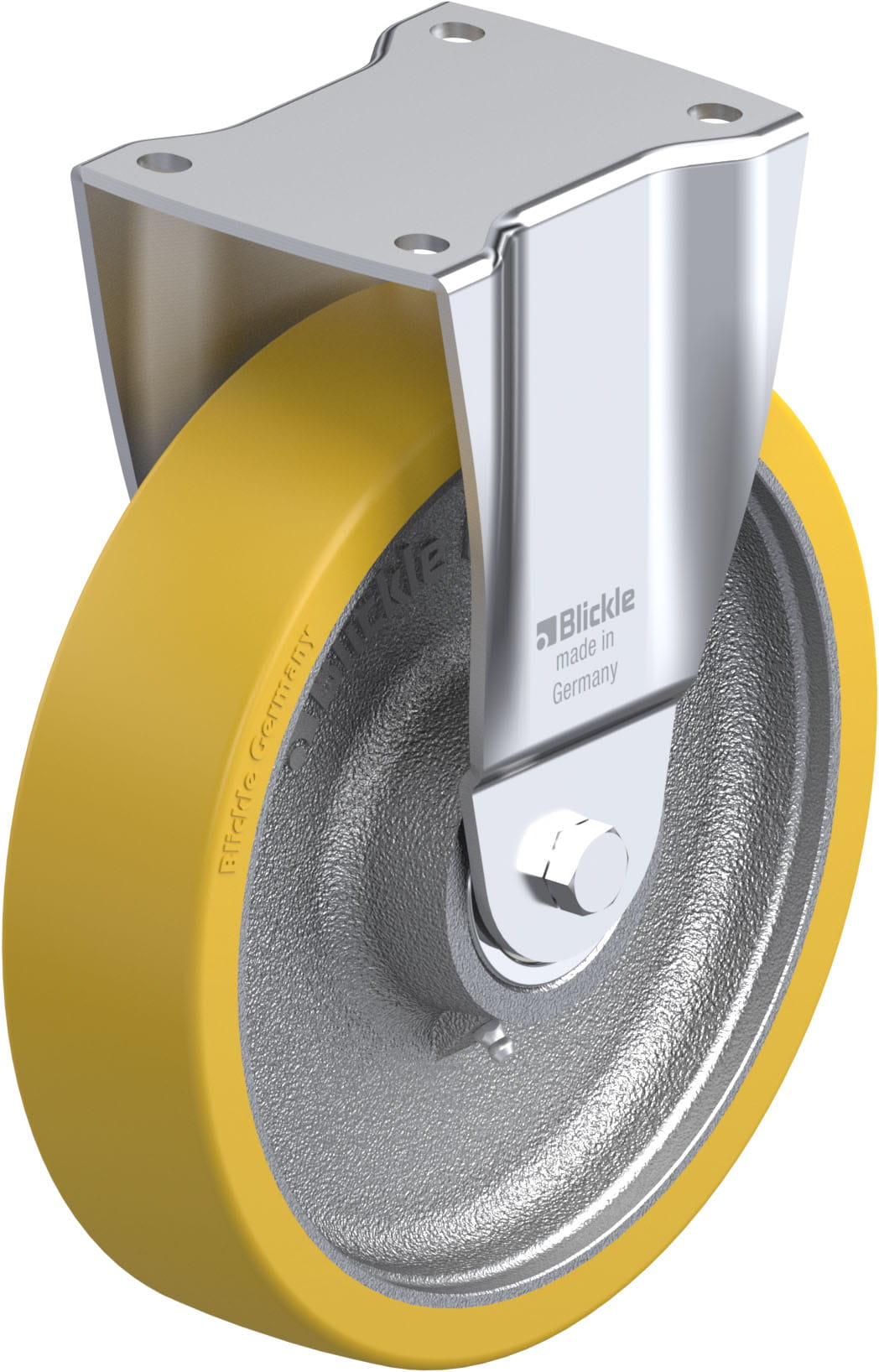 Pressed steel fixed castor, heavy duty design, with top plate fitting, heavy duty wheel, with Blickle Extrathane® polyurethane tread, with cast iron wheel centre