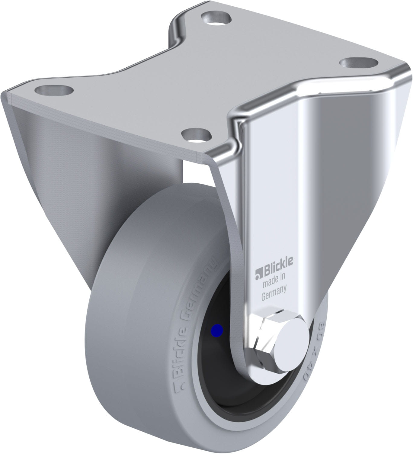 Pressed steel fixed castor, heavy duty design, with top plate fitting, heavy duty wheel, with ‘Blickle EasyRoll’ elastic solid rubber tyres, with nylon wheel centre, non-marking, grey, with synthetic thr ead guard
