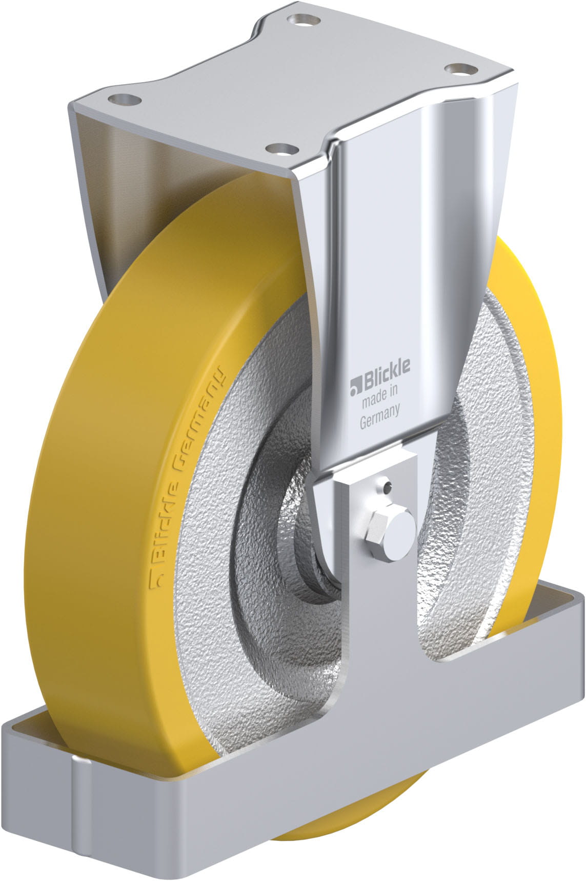 Pressed steel fixed castor, heavy duty design, with top plate fitting, steel foot guard, heavy duty wheel, with Blickle Extrathane® polyurethane tread, with welded steel wheel centre