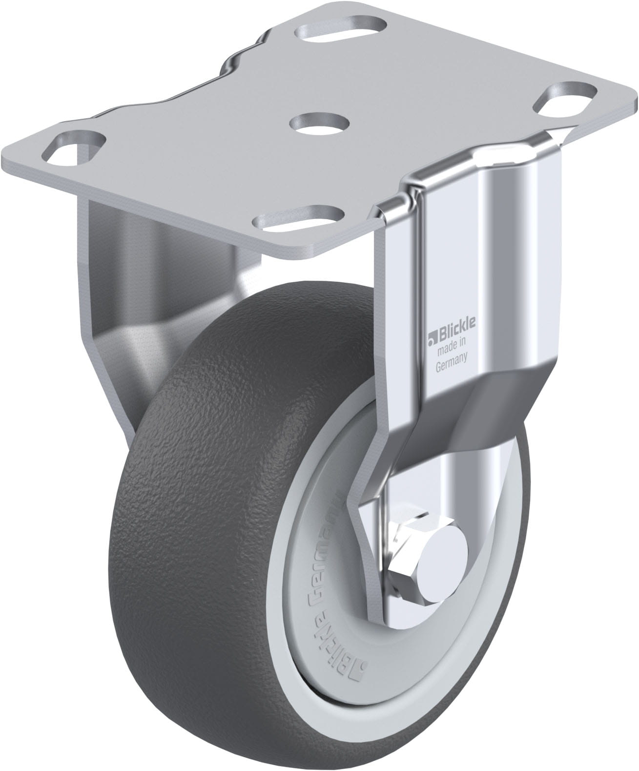 Light duty fixed castor, with top plate fitting, wheel, with thermoplastic polyurethane tread, with nylon wheel centre, with synthetic thread guard, electrically conductive, non-mar king