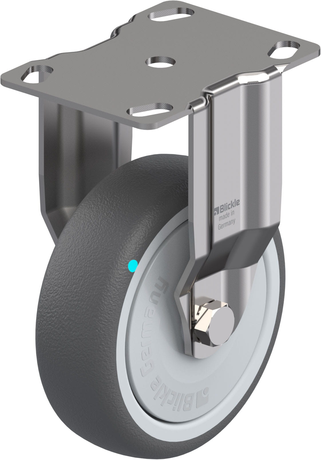 Stainless steel light duty fixed castor, with top plate fitting, wheel, with thermoplastic polyurethane tread, with nylon wheel centre, with synthetic...