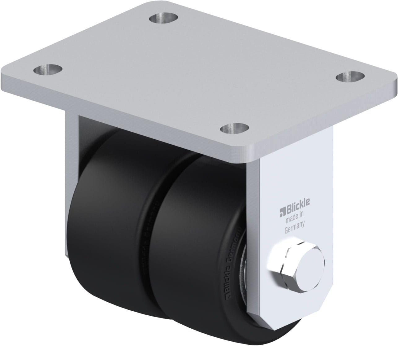 Heavy duty welded steel twin wheel fixed castor Heavy duty wheel, with ‘Blickle EasyRoll’ elastic solid rubber tyres, with steel wheel centre