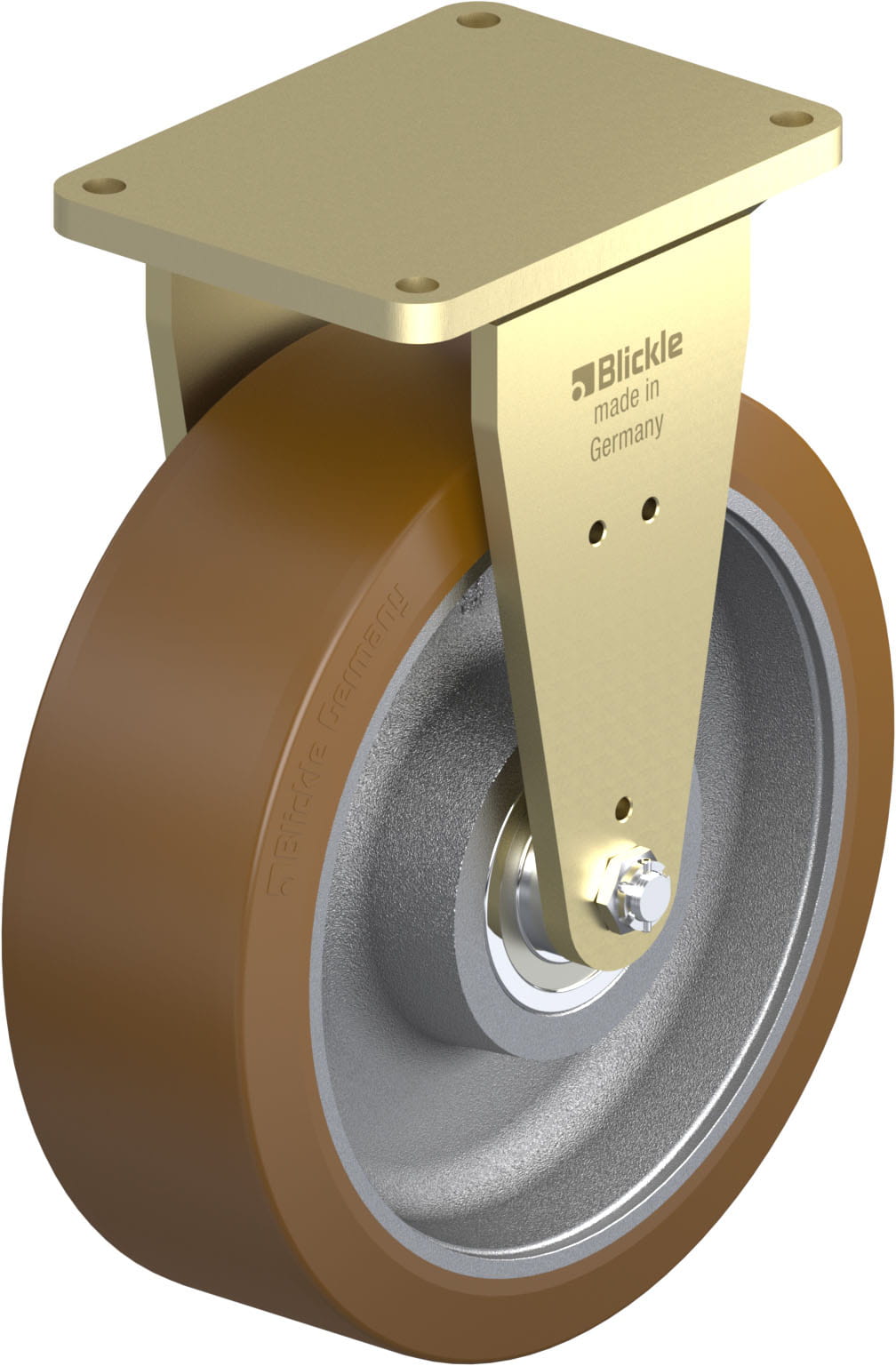 • tread: high-quality polyurethane elastomer Blickle Besthane®, hardness 92 Shore A, colour brown, non-marking, non-staining
