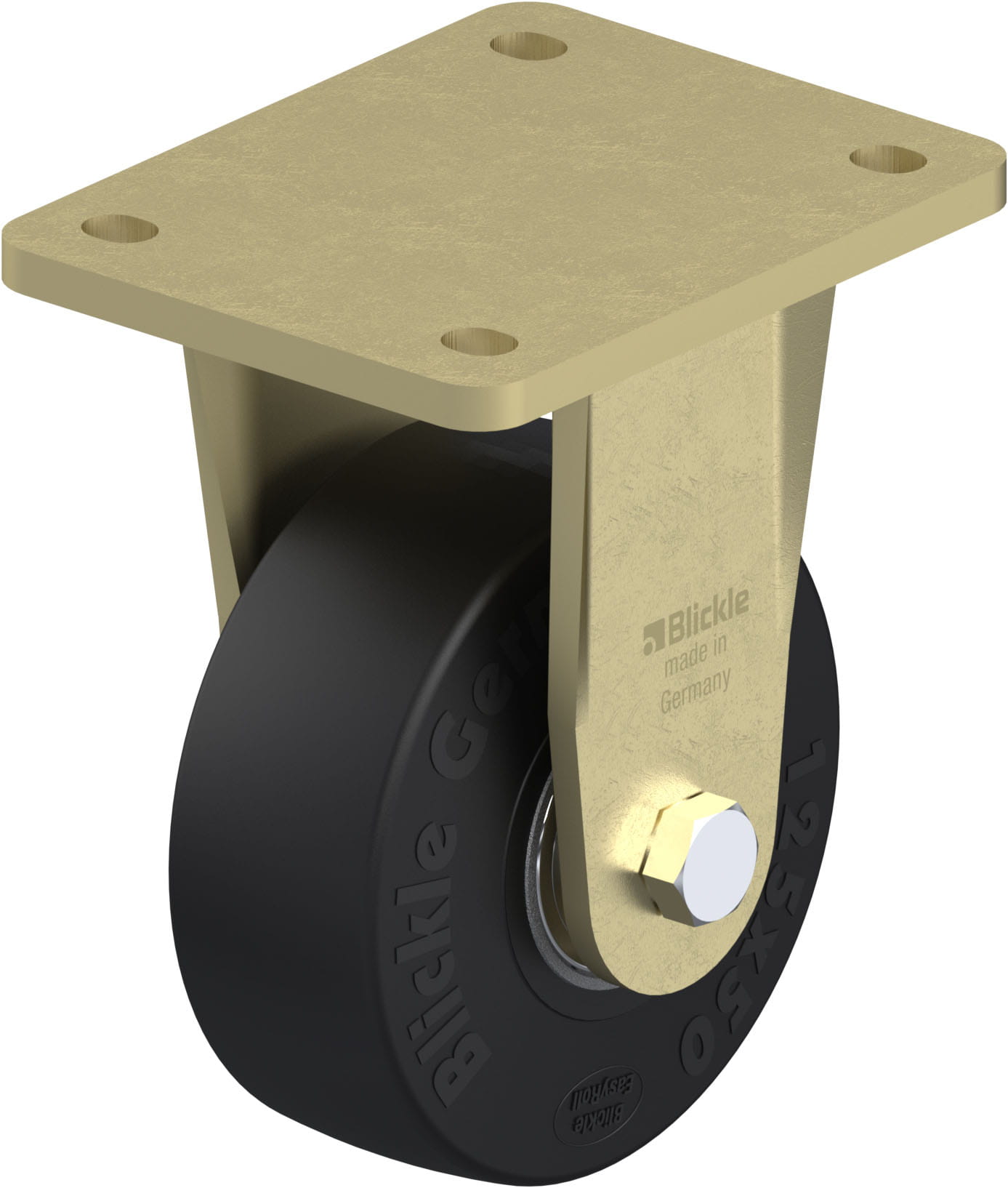 Heavy duty welded steel fixed castor Heavy duty wheel, with ‘Blickle EasyRoll’ elastic solid rubber tyres, with steel wheel centre