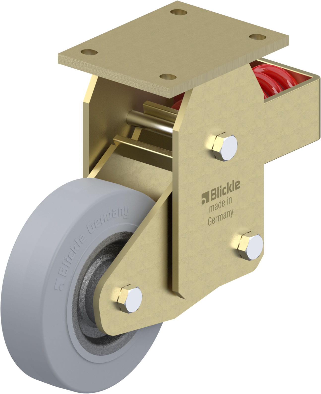 Heavy duty welded steel fixed castor, with steel spring, heavy duty wheel, with ‘Blickle EasyRoll’ elastic solid rubber tyres, with steel wheel centre, non-marking, grey