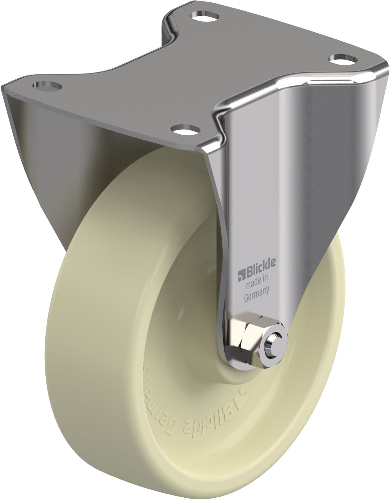 Stainless steel fixed castor, with top plate fitting, nylon wheel