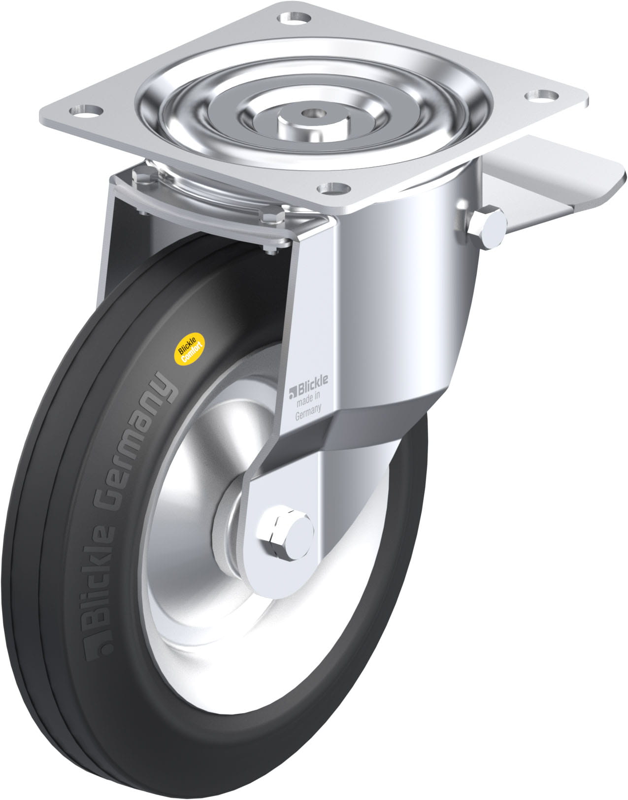 Pressed steel swivel castor, medium duty design, with top plate fitting, with brake system ‘stop-top’, wheel, with ‘Blickle Comfort’ two-component solid rubber tyres, with pressed steel rim
