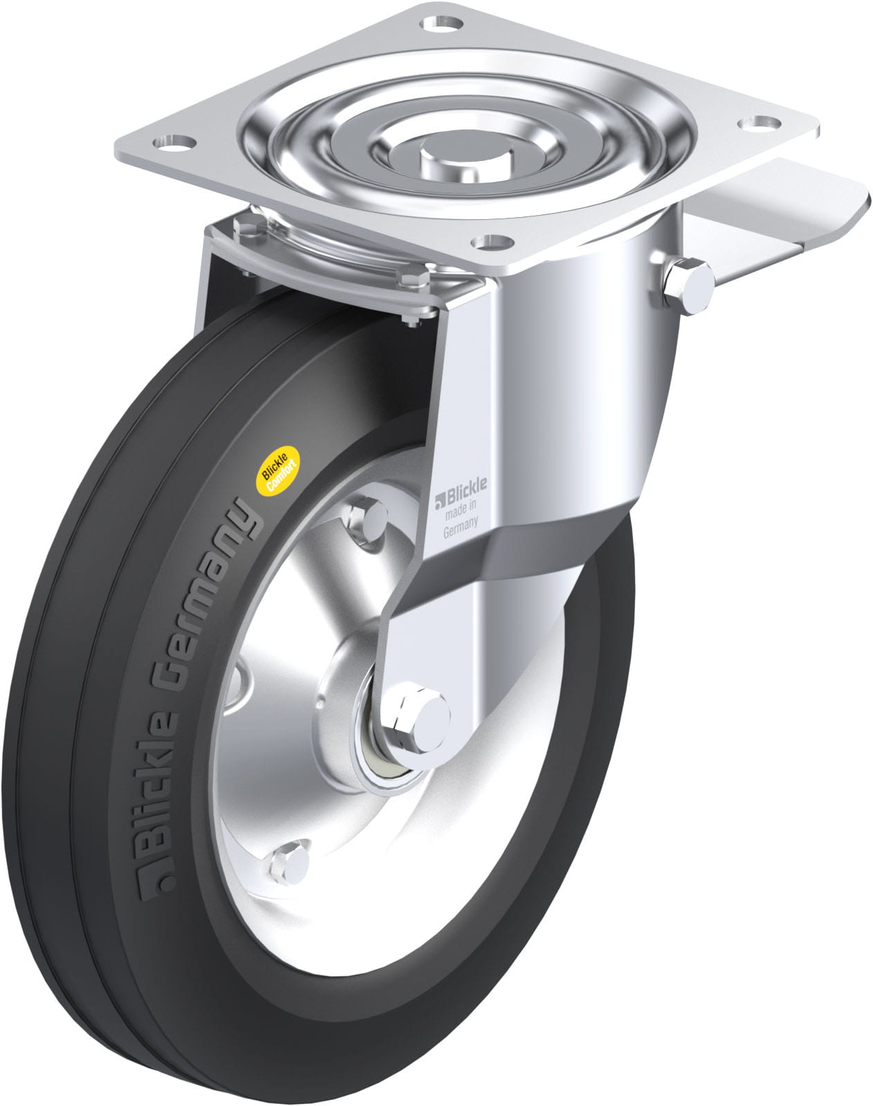 Pressed steel swivel castor, medium duty design, with top plate fitting, with brake system ‘stop-top’, wheel, with ‘Blickle Comfort’ two-component solid rubber tyres, with pressed steel rim