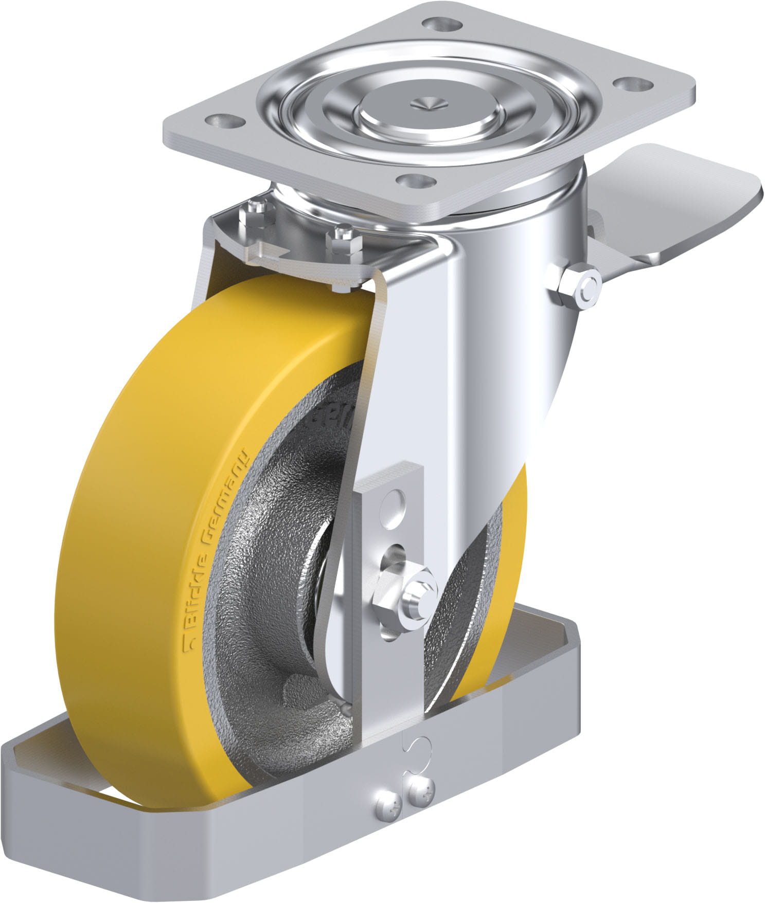 Pressed steel swivel castor, heavy duty design, with top plate fitting, with brake system ‘stop-top’, steel foot guard, heavy duty wheel, with Blickle Extrathane® polyurethane tread, with cast iron wheel centre