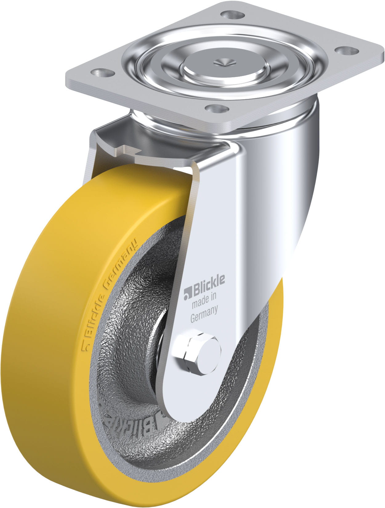 Pressed steel swivel castor, heavy duty design, with top plate fitting, heavy duty wheel, with Blickle Extrathane® polyurethane tread, with cast iron wheel centre