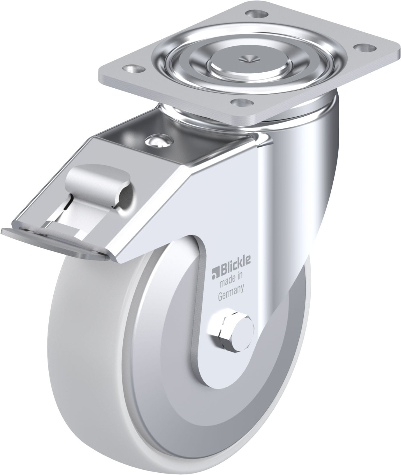 Pressed steel swivel castor, heavy duty design, with top plate fitting, with brake system ‘stop-fix’, nylon wheel, with steel thread guard
