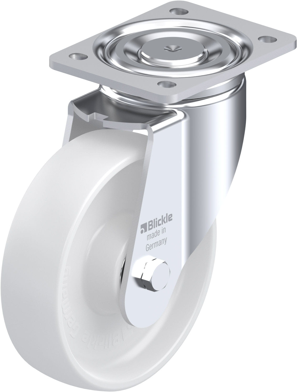 Pressed steel swivel castor, heavy duty design, with top plate fitting, nylon wheel
