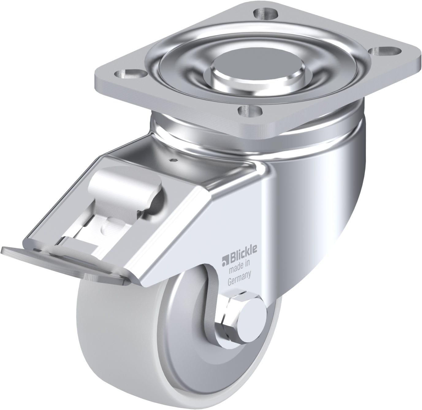 Pressed steel swivel castor, heavy duty design, with top plate fitting, with brake system ‘stop-fix’, nylon wheel, with steel thread guard