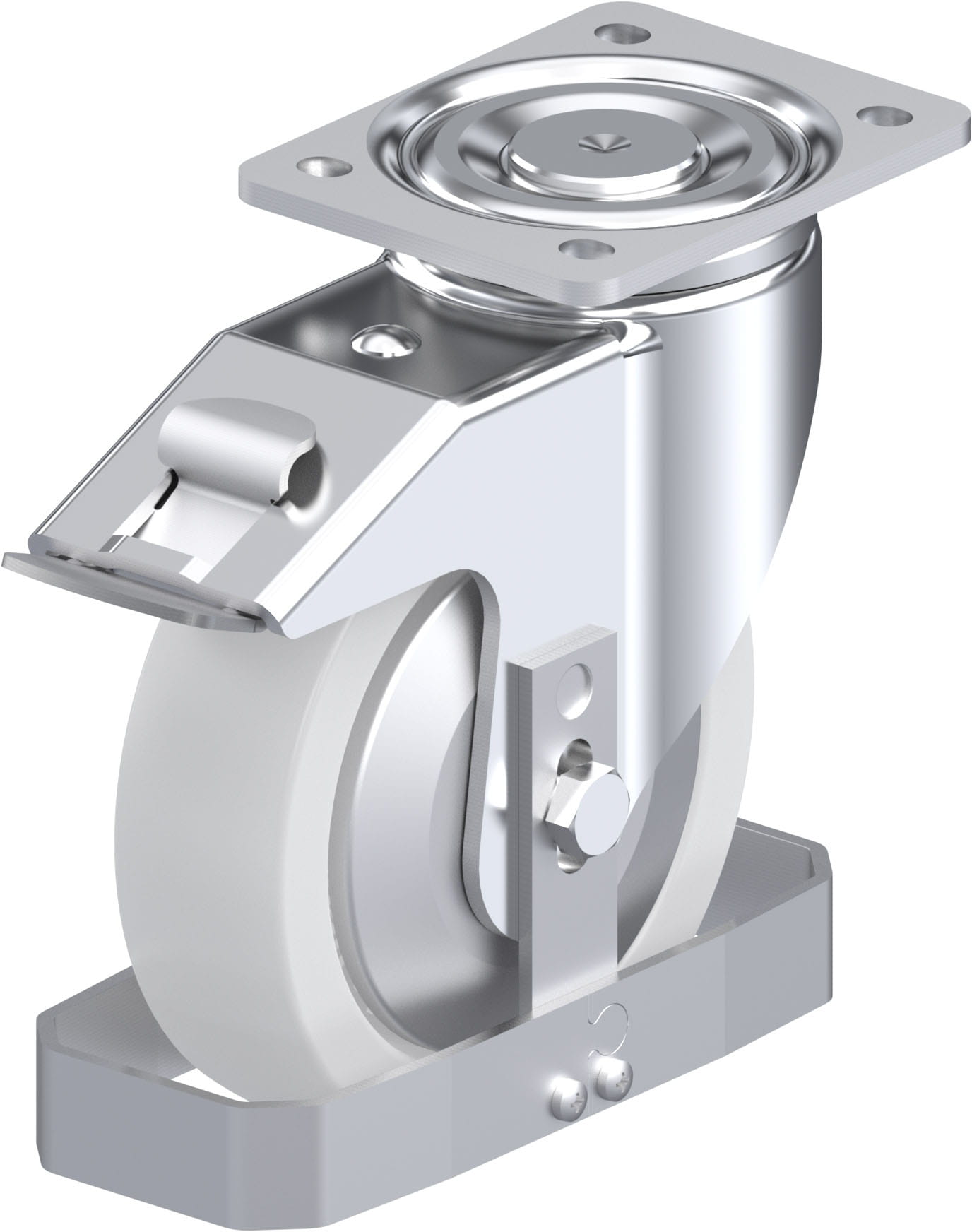 Pressed steel swivel castor, heavy duty design, with top plate fitting, with brake system ‘stop-fix’, steel foot guard, nylon heavy duty wheel, with steel thread guard