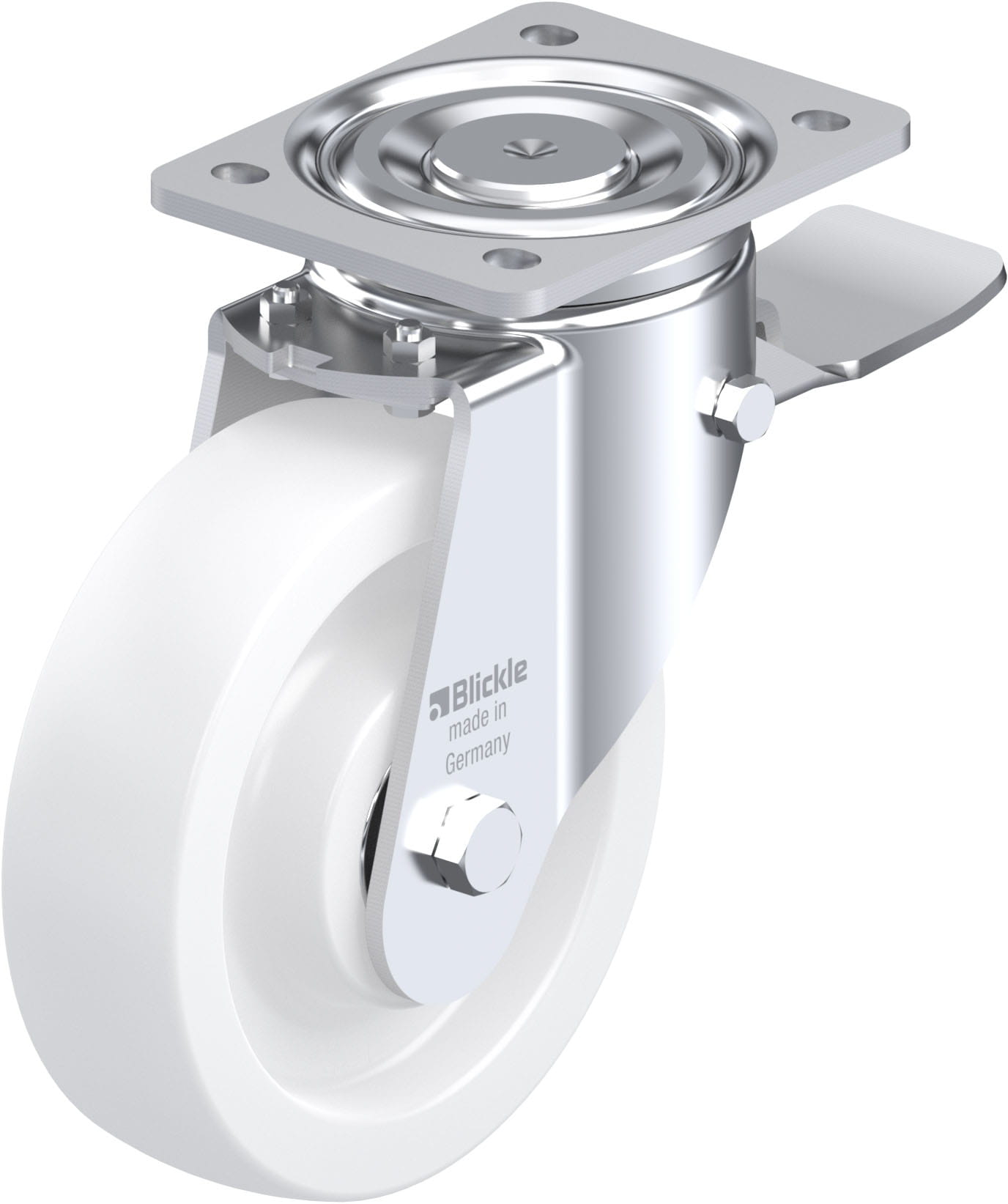 Pressed steel swivel castor, heavy duty design, with top plate fitting, with brake system ‘stop-top’, nylon heavy duty wheel