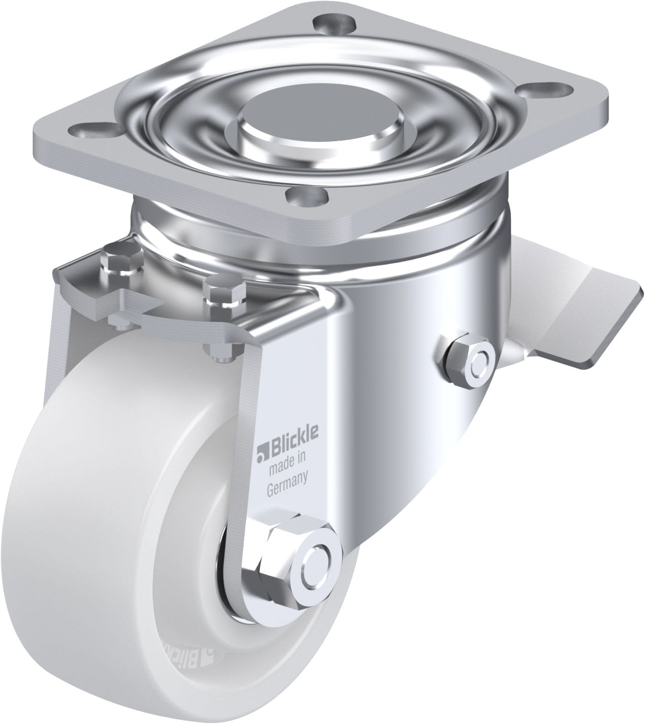 Pressed steel swivel castor, heavy duty design, with top plate fitting, with brake system ‘stop-top’, nylon heavy duty wheel