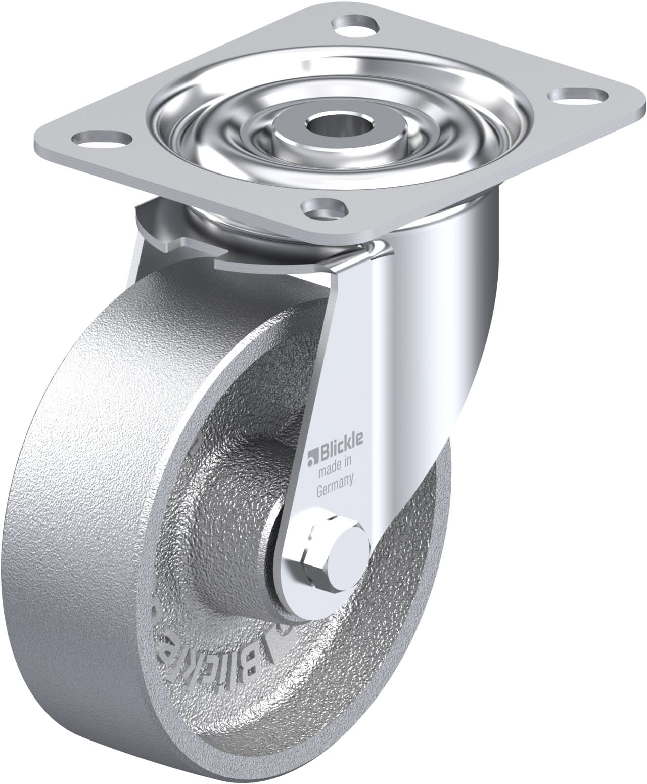 Pressed steel swivel castor, with top plate fitting, heat-resistant, cast iron wheelBracket: LI seriespressed steel, zinc-plated, blue-passivated, Cr6...