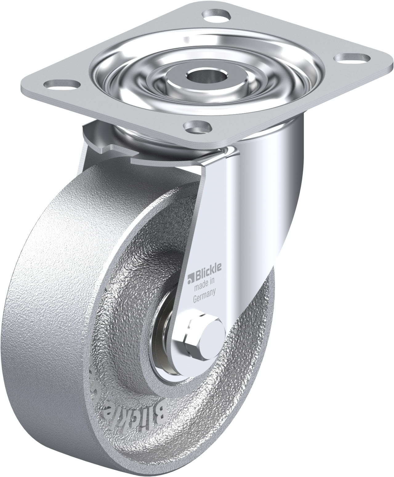 Pressed steel swivel castor, with top plate fitting, heat-resistant, cast iron wheelBracket: LI seriespressed steel, zinc-plated, blue-passivated, Cr6...