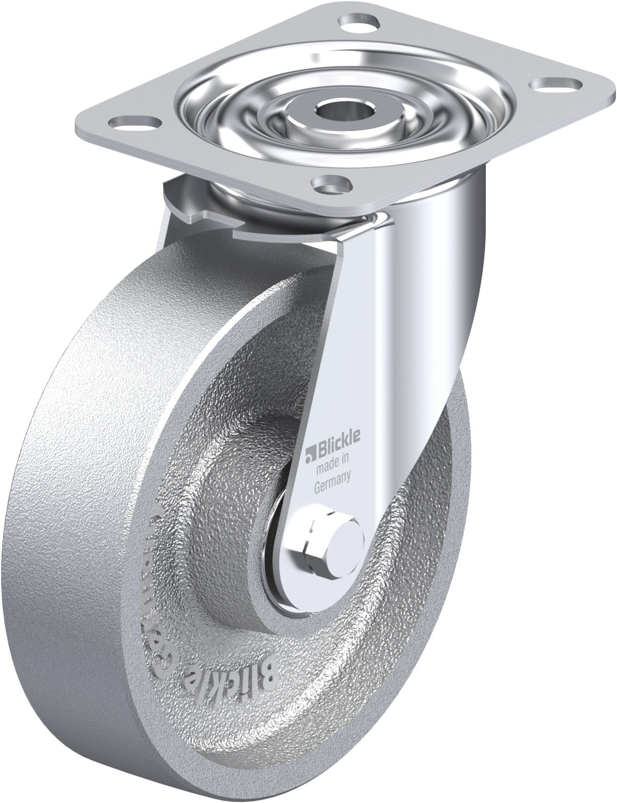 Pressed steel swivel castor, with top plate fitting, heat-resistant, cast iron wheel