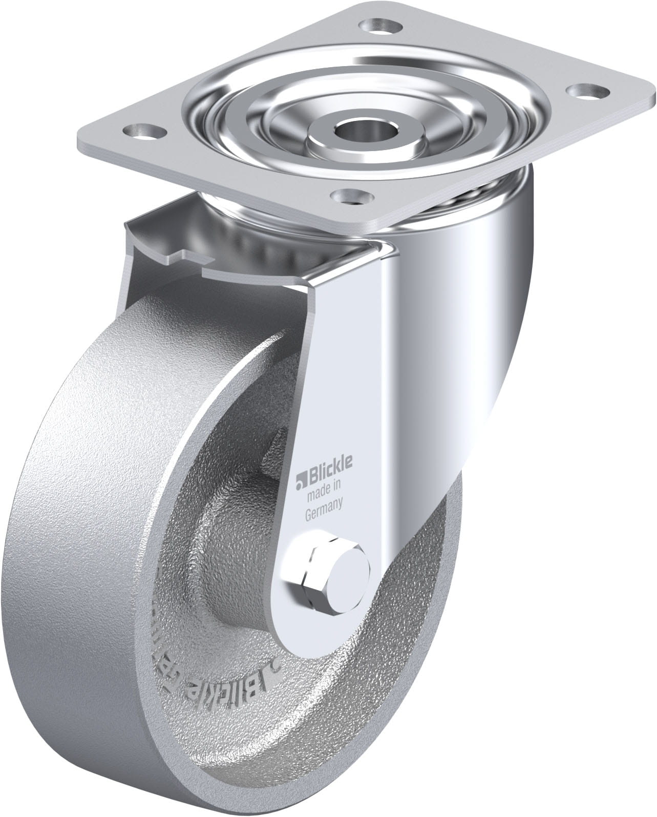 Pressed steel swivel castor, with top plate fitting, heat-resistant, cast iron wheelBracket: LI seriespressed steel, zinc-plated, blue-passivated, Cr6...