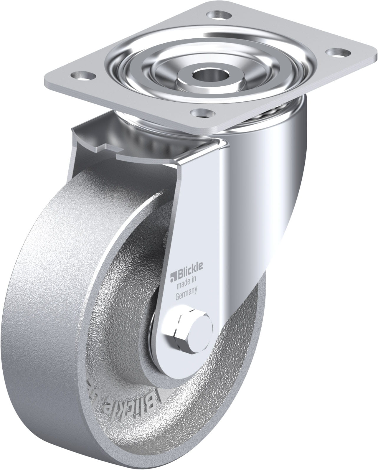 Pressed steel swivel castor, with top plate fitting, heat-resistant, cast iron wheelBracket: LI seriespressed steel, zinc-plated, blue-passivated, Cr6...