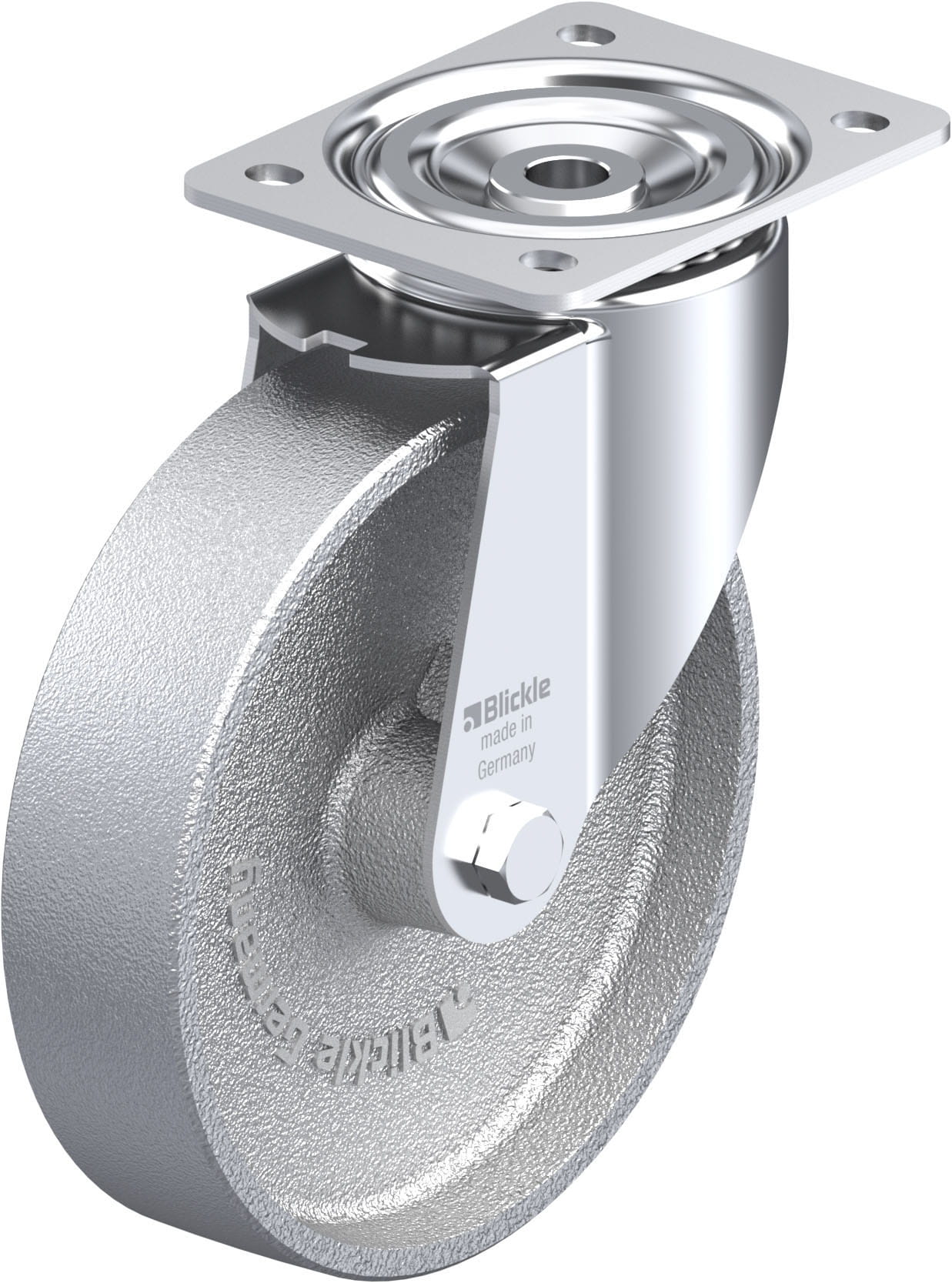 Pressed steel swivel castor, with top plate fitting, heat-resistant, cast iron wheelBracket: LI seriespressed steel, zinc-plated, blue-passivated, Cr6...