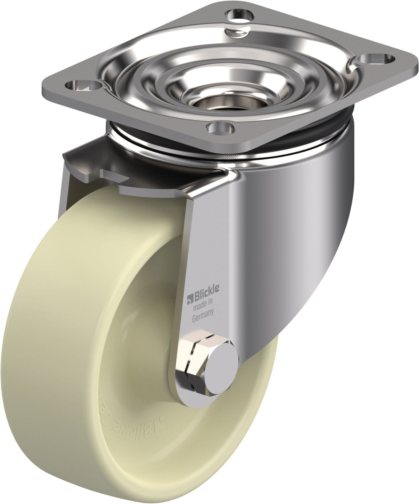 Stainless steel swivel castor, with top plate fitting, heat-resistant, nylon wheel