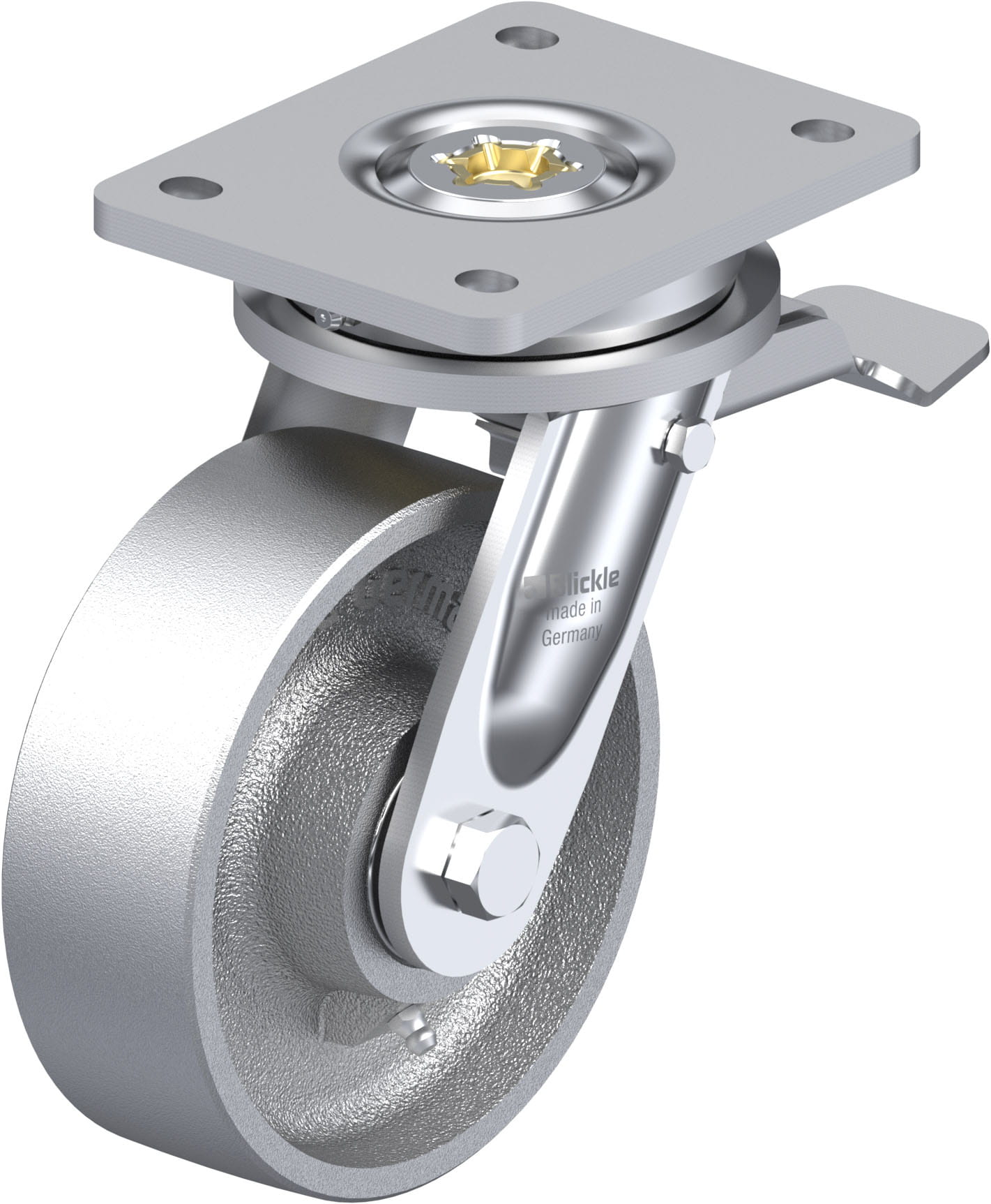 Heavy duty welded steel swivel castor, heat-resistant, with brake system ‘stop-top’, cast iron wheel