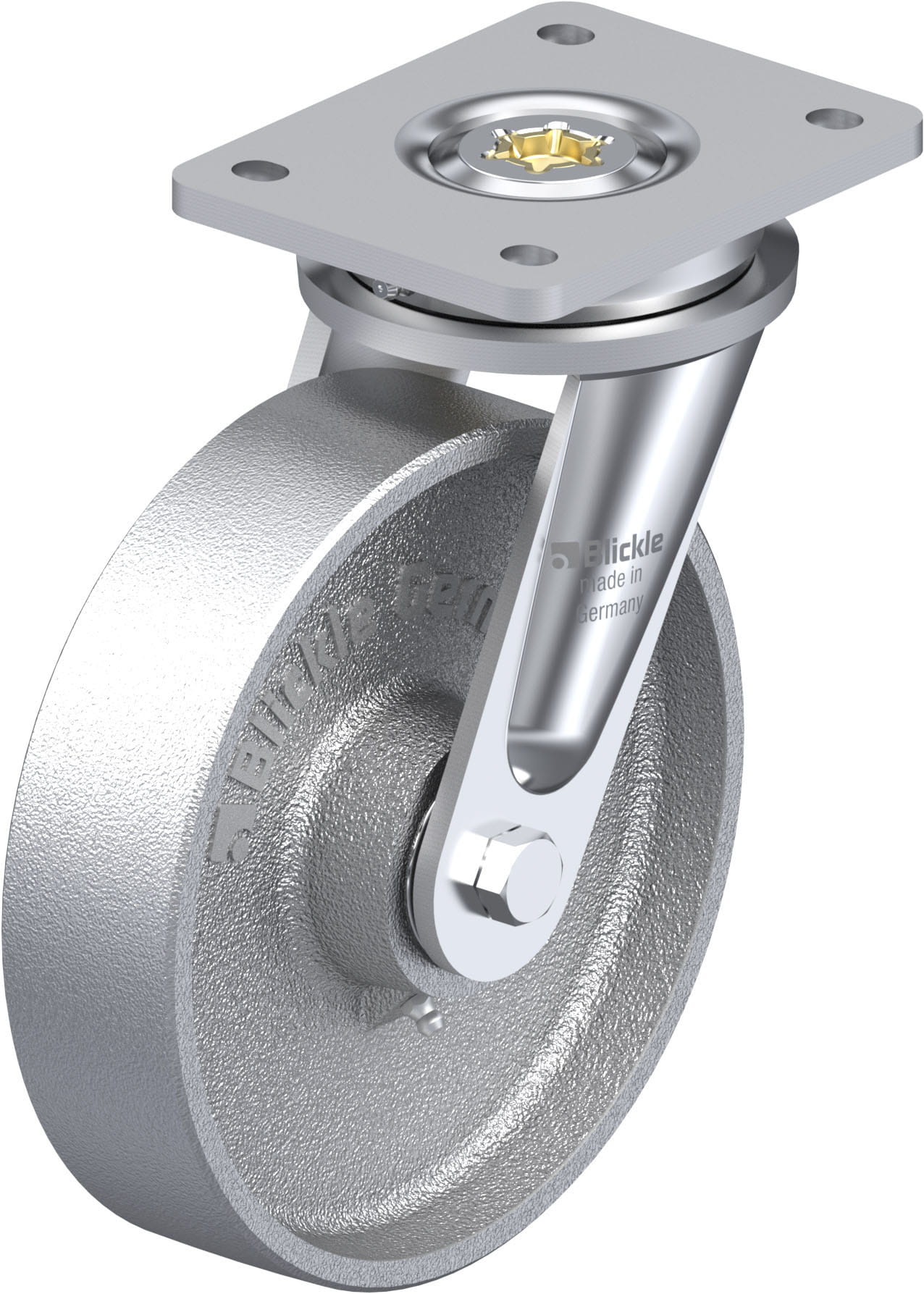 Heavy duty welded steel swivel castor, heat-resistant, cast iron wheelBracket: LIO seriessolid welded steel constructionpassivation may be altered sli...
