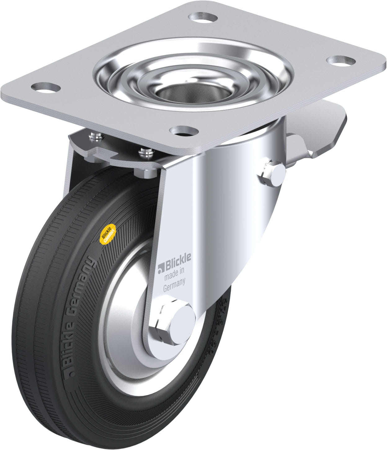 Pressed steel swivel castor, Heavy duty design, with brake system ‘stop-top’, wheel, with ‘Blickle Comfort’ two-component solid rubber tyres, with pressed steel rim, with steel thread guard