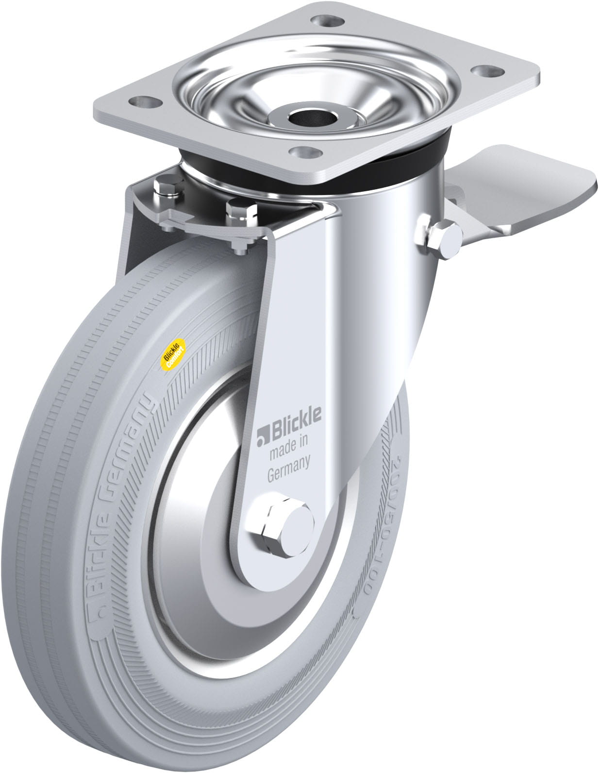 Pressed steel swivel castor, Heavy duty design, with brake system ‘stop-top’, wheel, with ‘Blickle Comfort’ two-component solid rubber tyres, with pressed steel rim, non-marking, grey, with steel thread guard