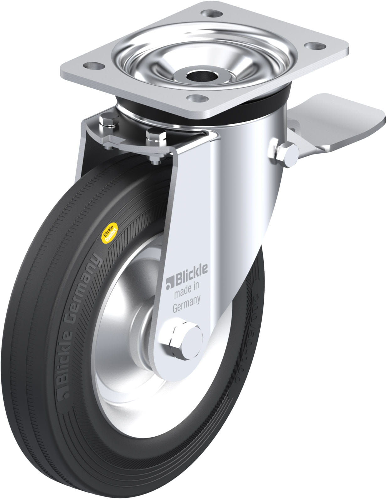 Pressed steel swivel castor, Heavy duty design, with brake system ‘stop-top’, wheel, with ‘Blickle Comfort’ two-component solid rubber tyres, with pressed steel rim