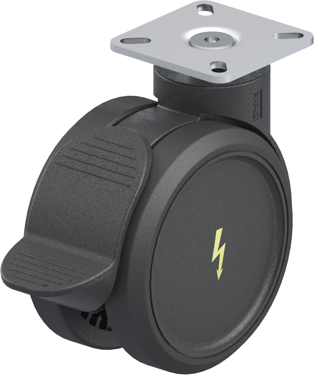 Synthetic twin wheel swivel castor, with top plate fitting, with brake system ‘Radstop’ Wheel, with thermoplastic polyurethane tread, with nylon wheel centre, electrically conductive, non-marking