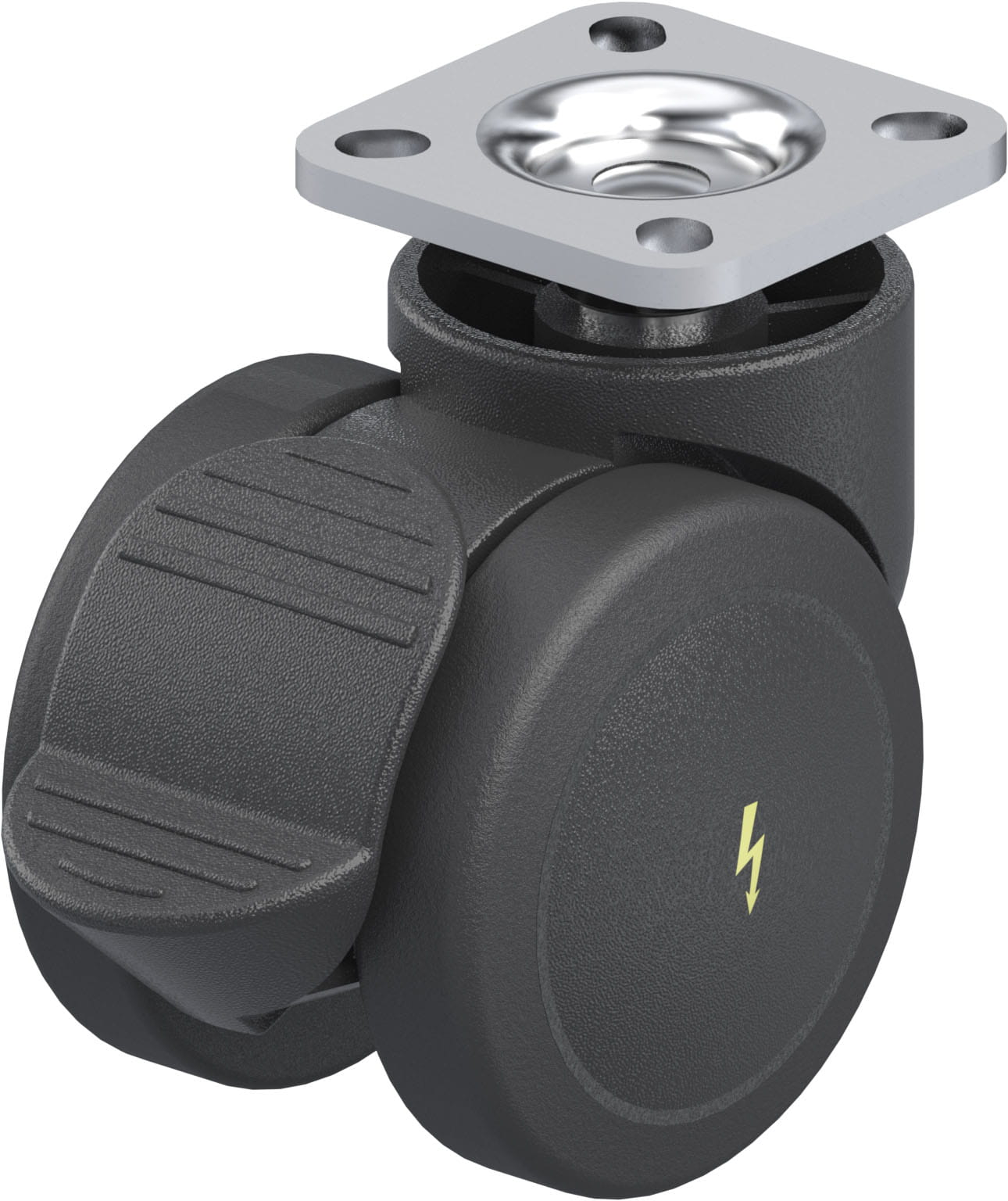 Synthetic twin wheel swivel castor, with top plate fitting, with brake system ‘Radstop’ Wheel, with thermoplastic polyurethane tread, with nylon wheel centre, electrically conductive, non-marking