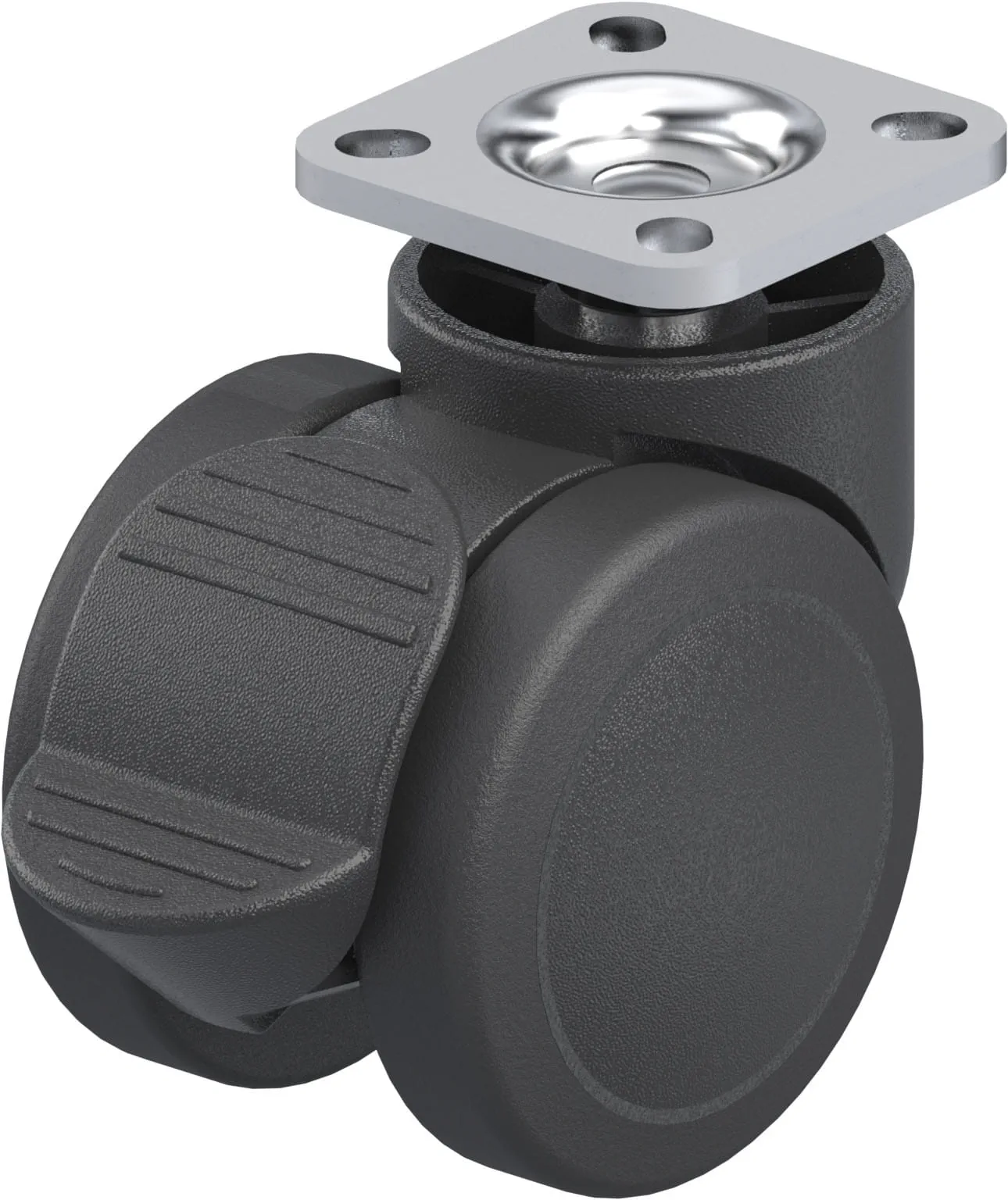 Synthetic twin wheel swivel castor, with top plate fitting, with brake system ‘Radstop’, wheel, with thermoplastic polyurethane tread, with nylon wheel centre