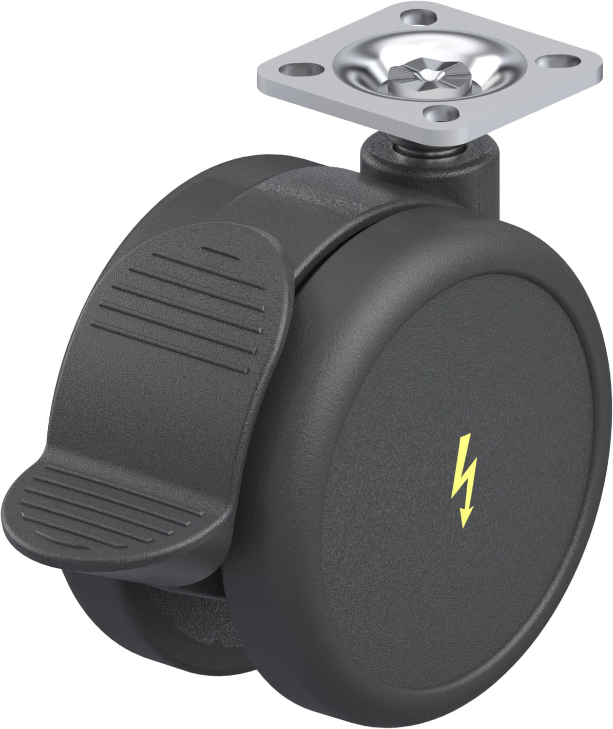 Synthetic twin wheel swivel castor, with top plate fitting, with brake system ‘Radstop’ Wheel, with thermoplastic polyurethane tread, with nylon wheel centre, electrically conductive, non-marking