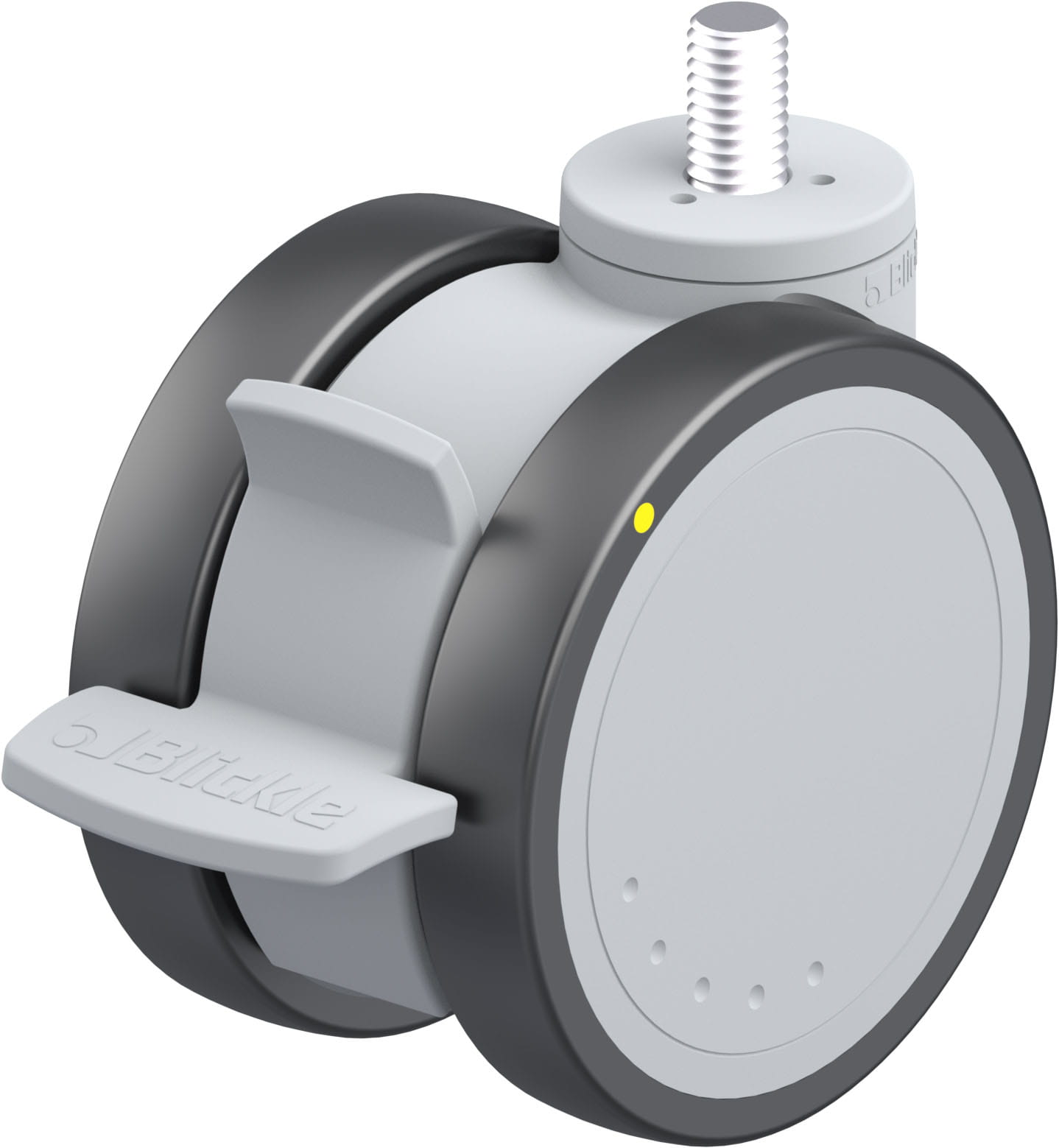 Blickle synthetic twin castor MOVE, colour silver grey, with threaded pin, with brake system ‘stop-fix’, wheel, with thermoplastic polyurethane tread, with nylon wheel centre, electrically conductive, non-marking