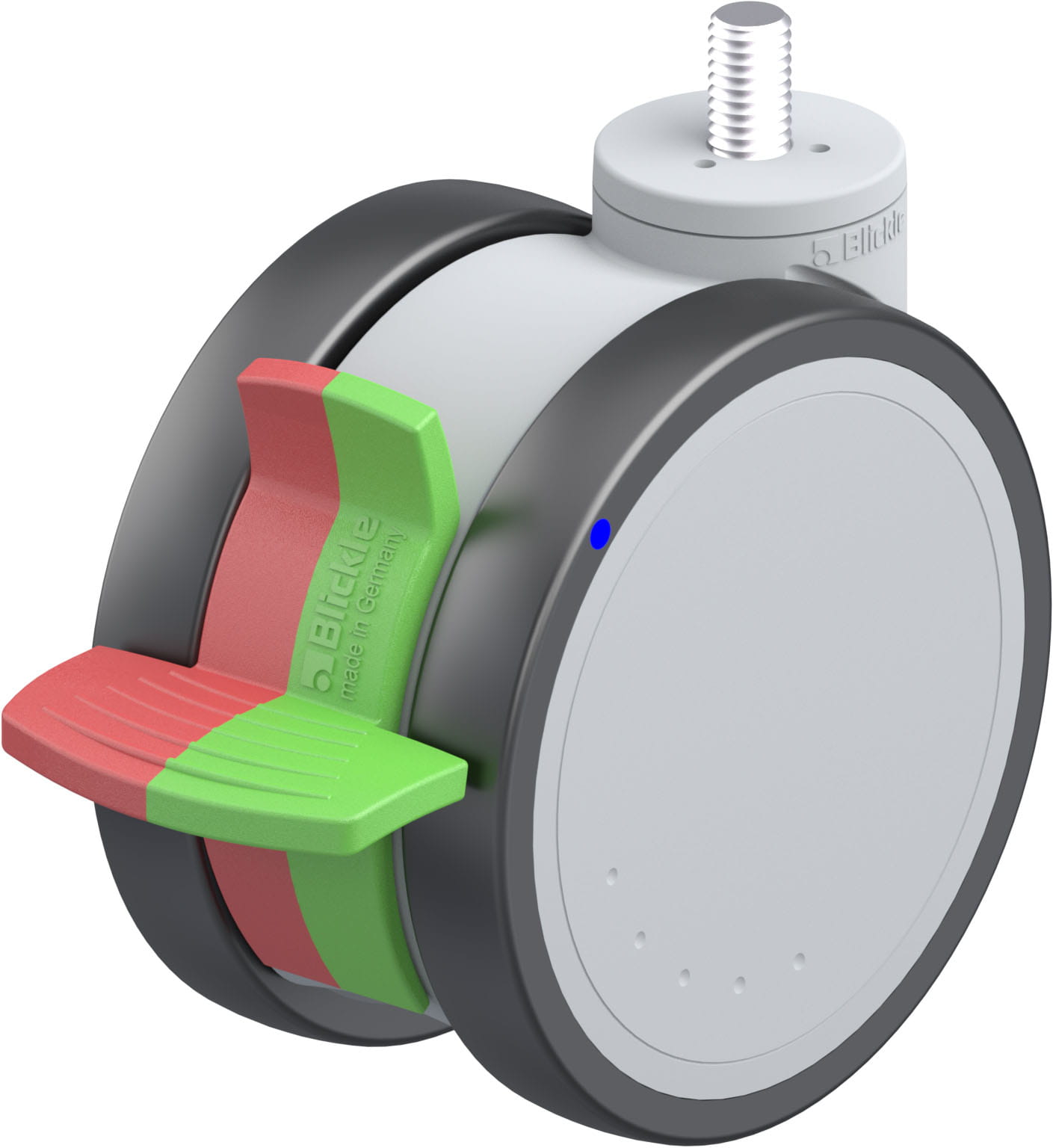 Blickle synthetic twin castor MOVE, corrosion-resistant, colour silver grey, with threaded pin, with directional lock combined, with wheel brake, wheel, with thermoplastic polyurethane tread, with nylon wheel centre