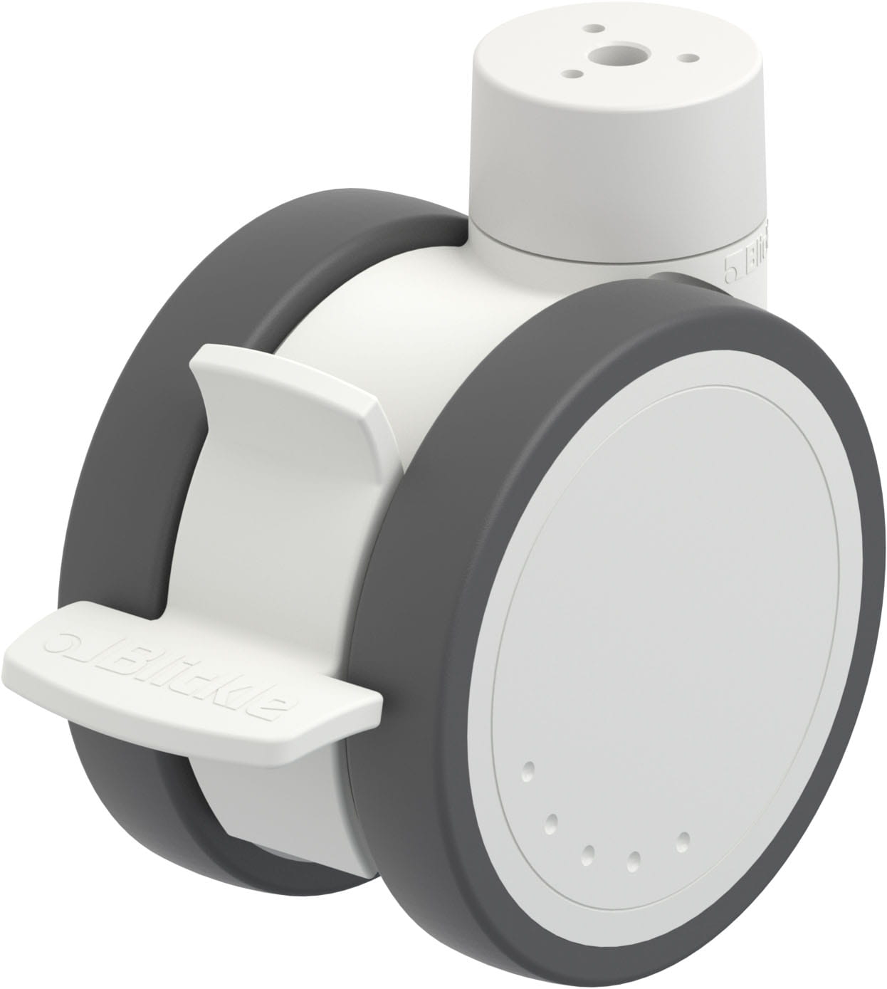Blickle synthetic twin castor MOVE, with special mounting height, colour grey white, with brake system ‘stop-fix’, wheel, with thermoplastic polyurethane tread, with nylon wheel centre