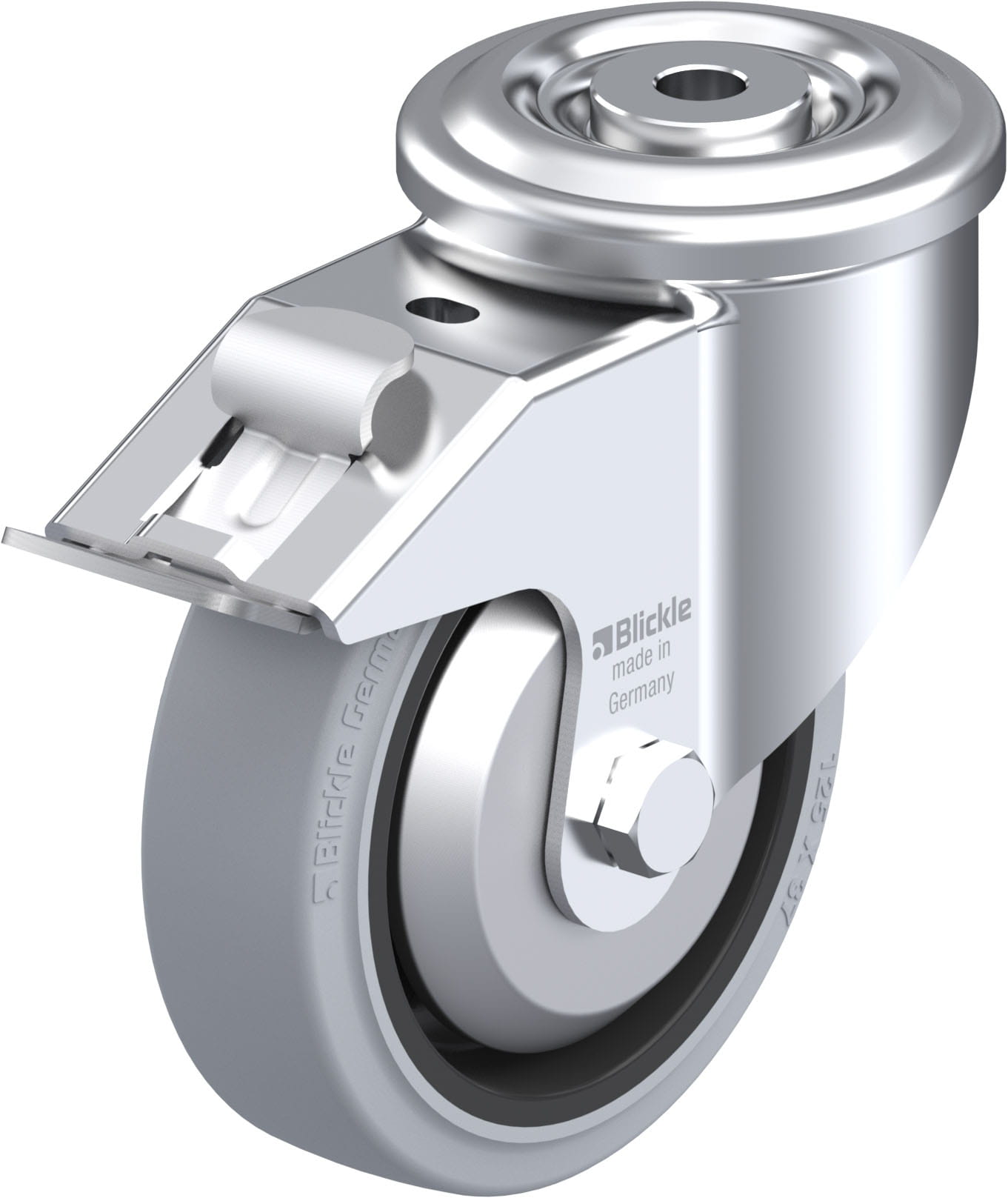 Pressed steel swivel castor, medium heavy duty brackets, with bolt hole fitting, with brake system ‘stop-fix’, heavy duty wheel, with ‘Blickle EasyRoll’ elastic solid rubber tyres, with nylon wheel centre, non-marking, grey, with synthetic thr ead guard, small, with additionals ball bearing seals, with steel thread guard