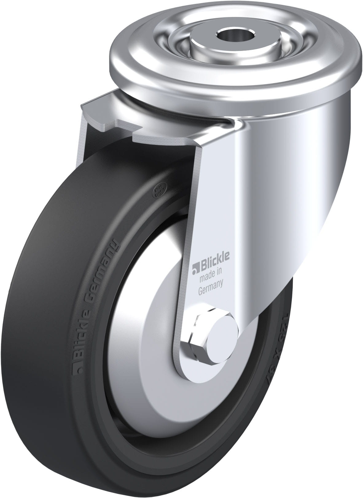 Pressed steel swivel castor, medium heavy duty brackets, with bolt hole fitting, heavy duty wheel, with ‘Blickle EasyRoll’ elastic solid rubber tyres, with nylon wheel centre, with steel thread guard