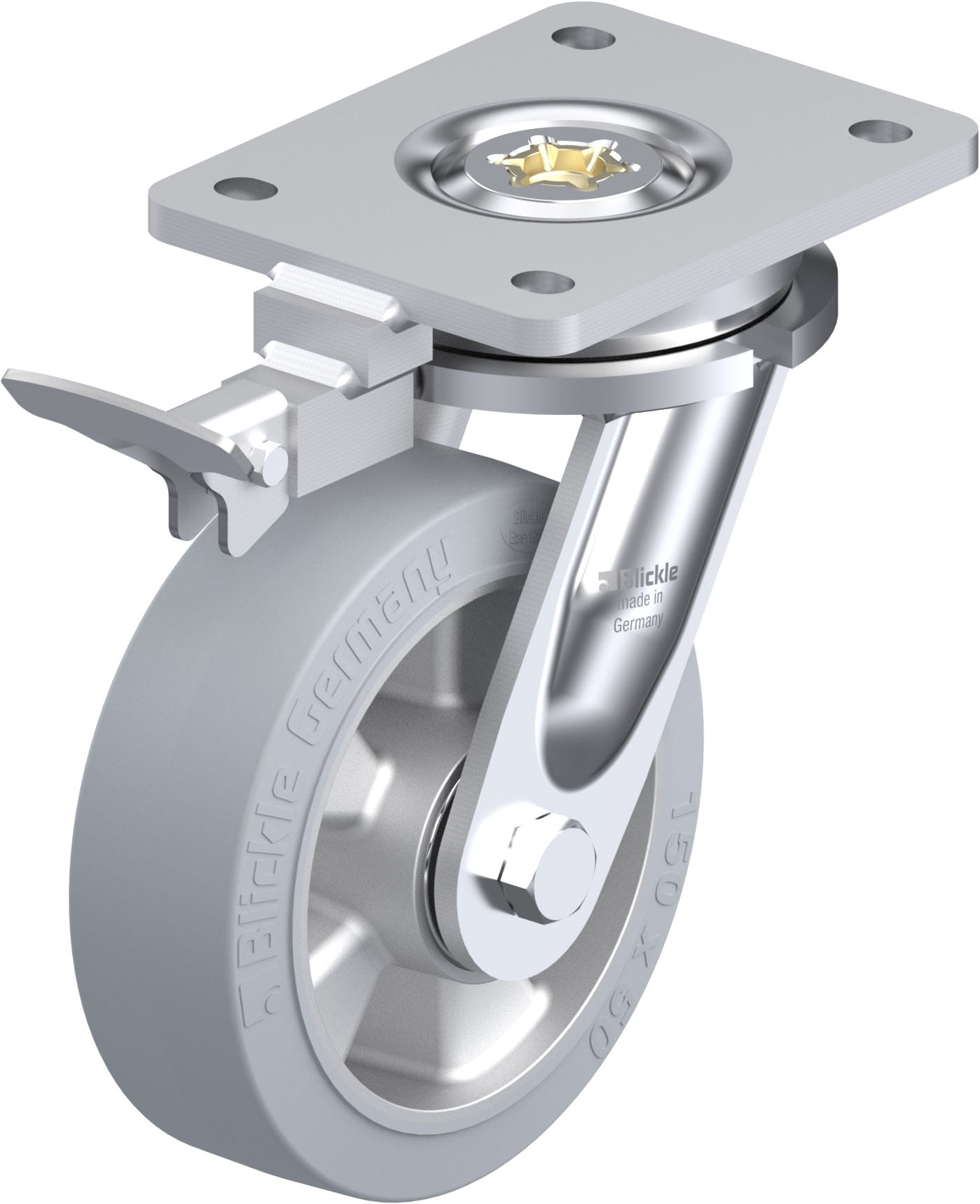 Heavy duty welded steel swivel castor, with directional lock, heavy duty wheel, with ‘Blickle EasyRoll’ elastic solid rubber tyres, with aluminium wheel centre, non-marking, grey