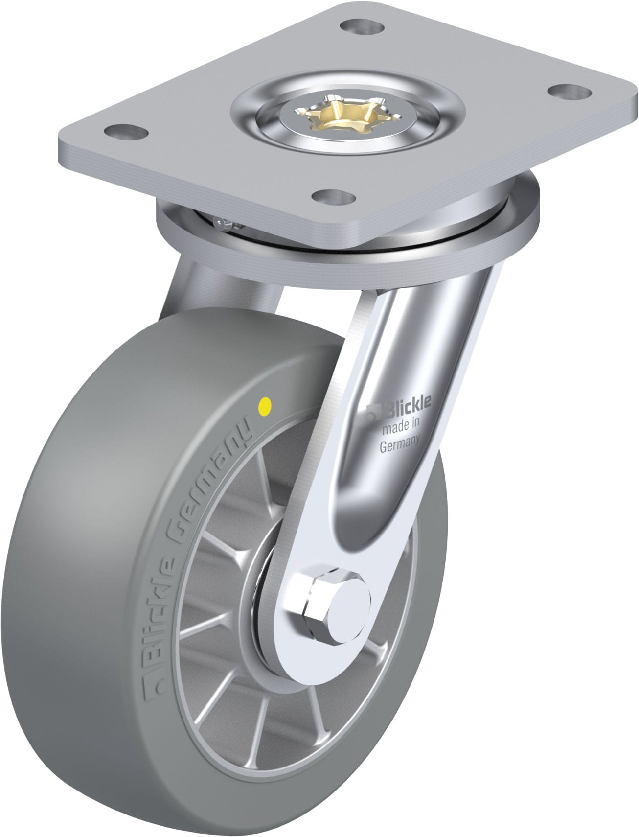 - tread: high-quality polyurethane elastomer Blickle Extrathane®, hardness 92 Shore A, colour grey, non-marking, non-staining