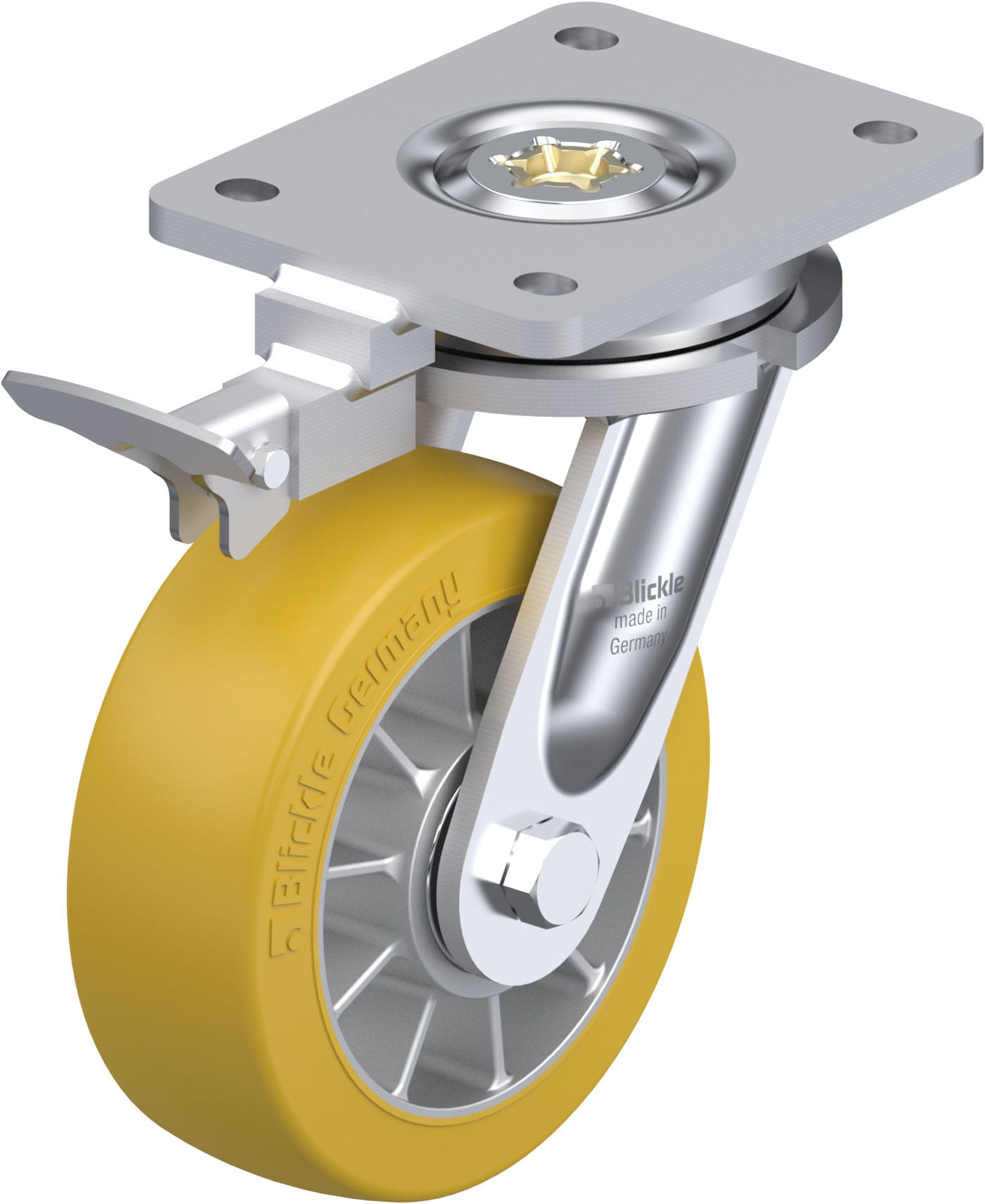 Heavy duty welded steel swivel castor, with directional lock, heavy duty wheel, with Blickle Extrathane® polyurethane tread, with aluminium wheel centre